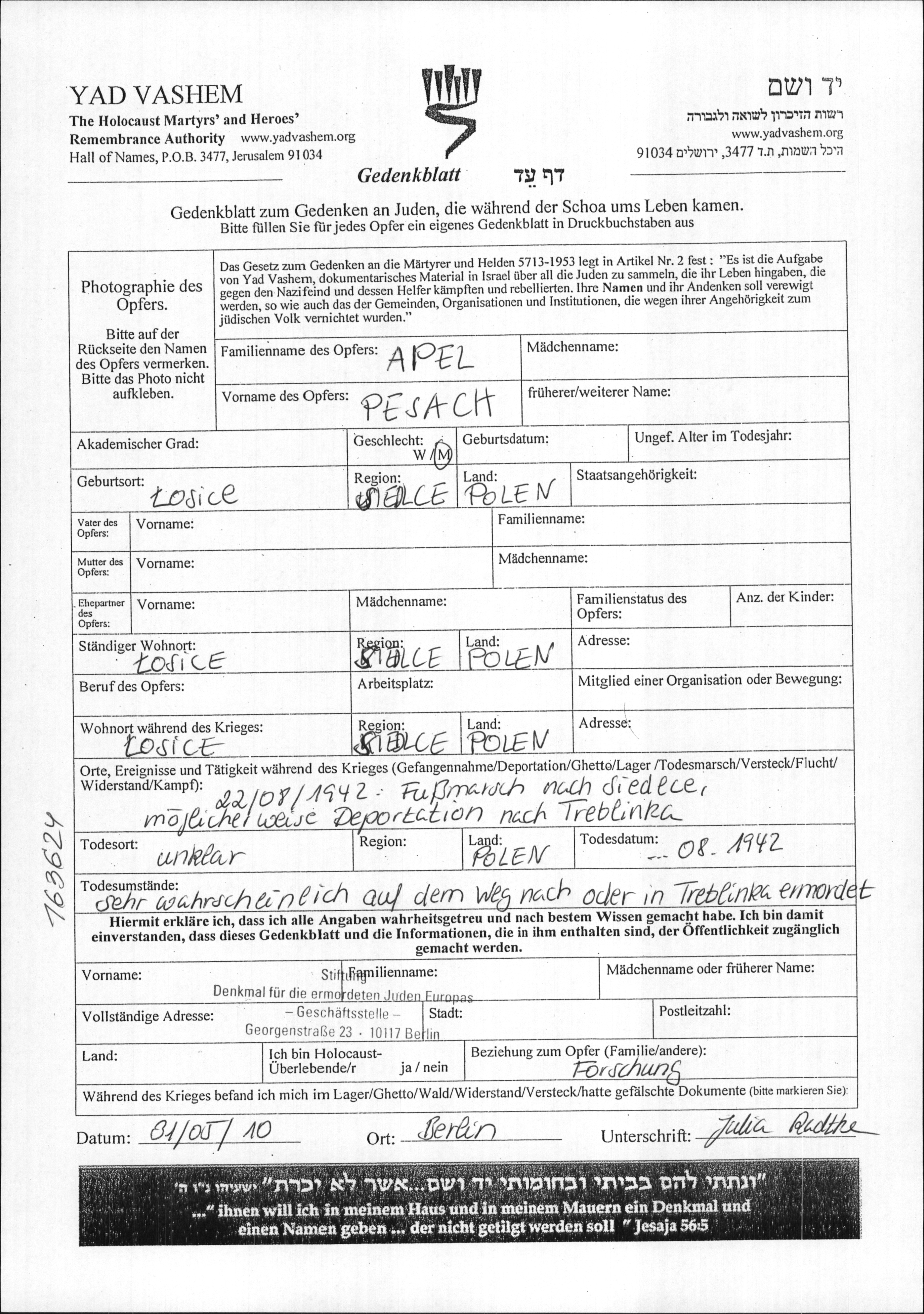 Pesach Apel was born in Losice, Poland. Prior to WWII he lived in Losice, Poland. During the war he was in Losice, Poland. Pesach was murdered in the Shoah. Place of death: Poland, 08/1942.