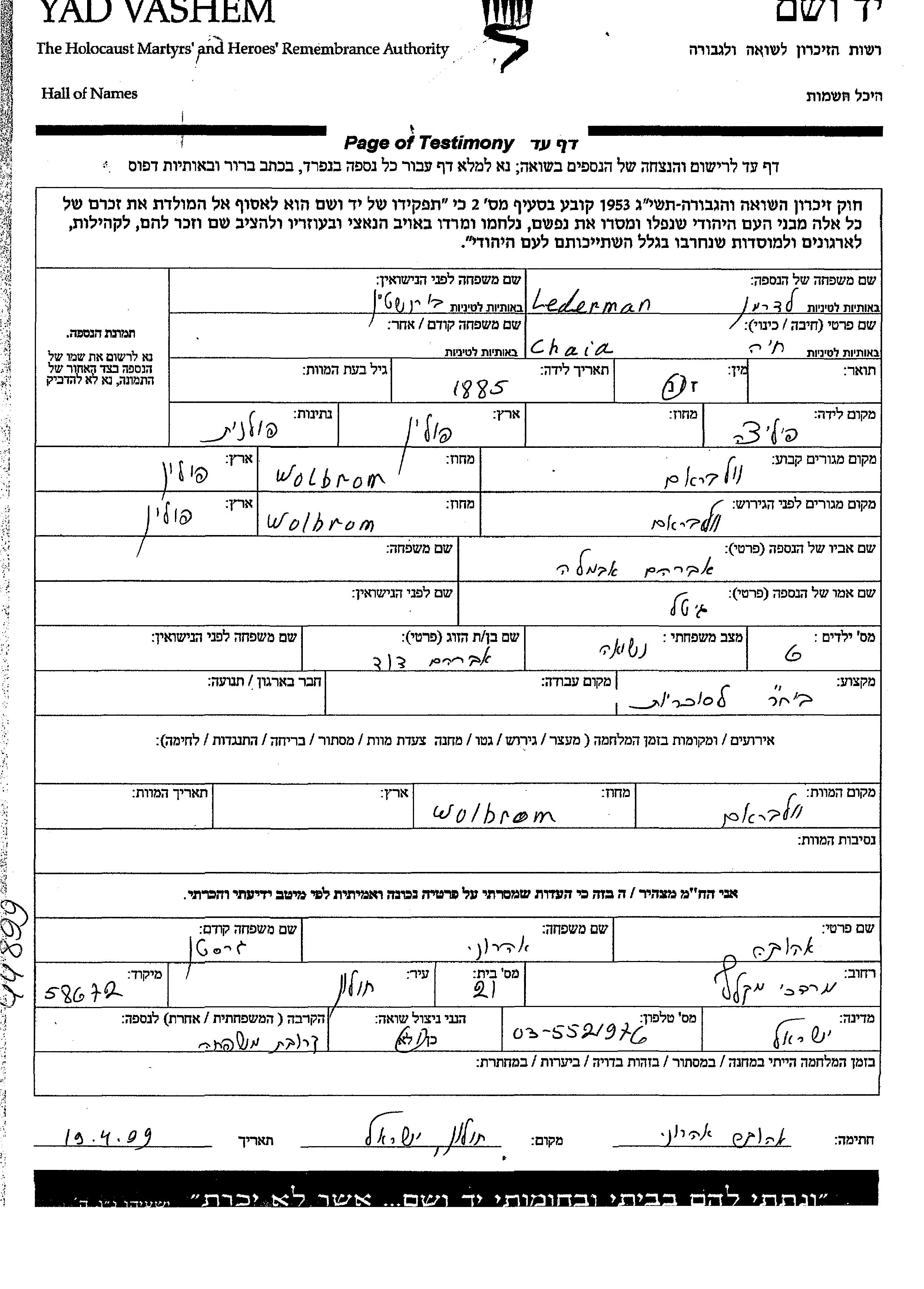 Chaia Lederman nee Bornshtein was born in Pilica, Poland, 1885 to Avraham and Gitel. She was married to Avraham David. Prior to WWII she lived in Wolbrom, Poland. During the war she was in Wolbrom, Poland. Chaia was murdered in the Shoah. Place of death: Wolbrom, Poland.