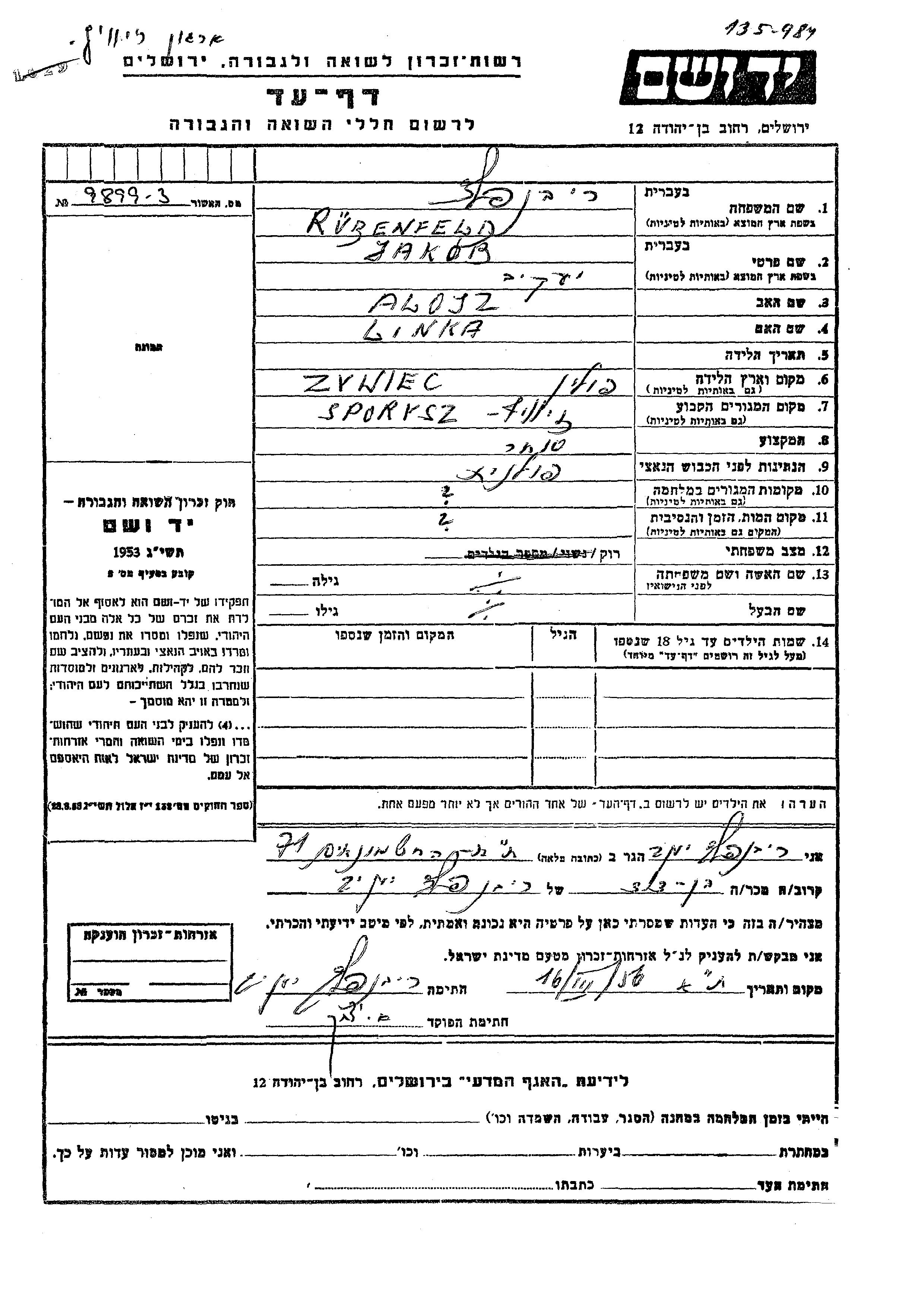 Rubenfeld Ribenfeld Jakob Sporysz, Poland Page of Testimony