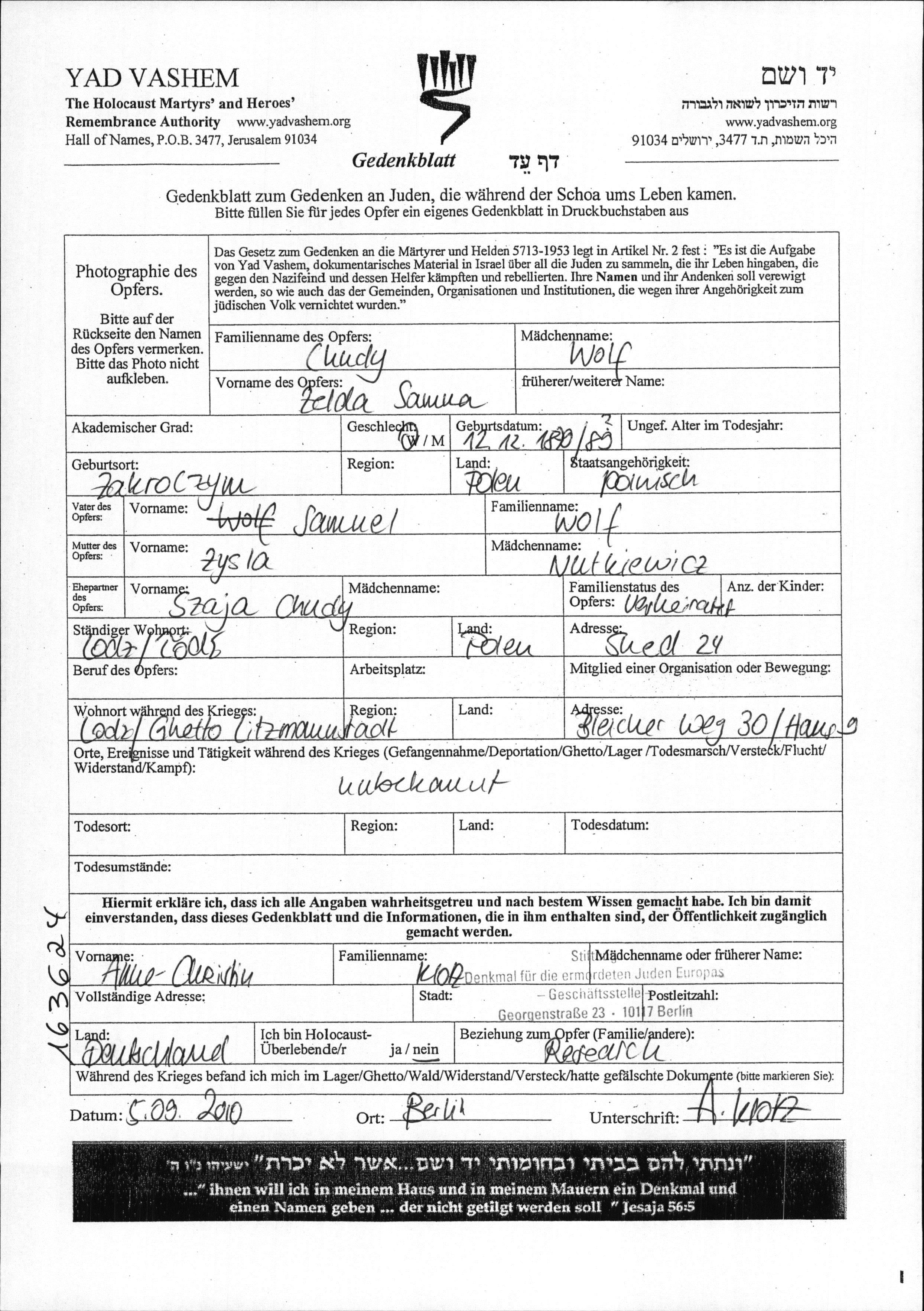 Zelda Samka Chudy nee Wolf was born in Zakroczym, Poland, 1879 to Samuel and Zysla nee Nutkiewicz. She was married to Szaja. Prior to WWII she lived in Lodz, Poland. During the war she was in Lodz, Poland. Zelda Samka was murdered in the Shoah.