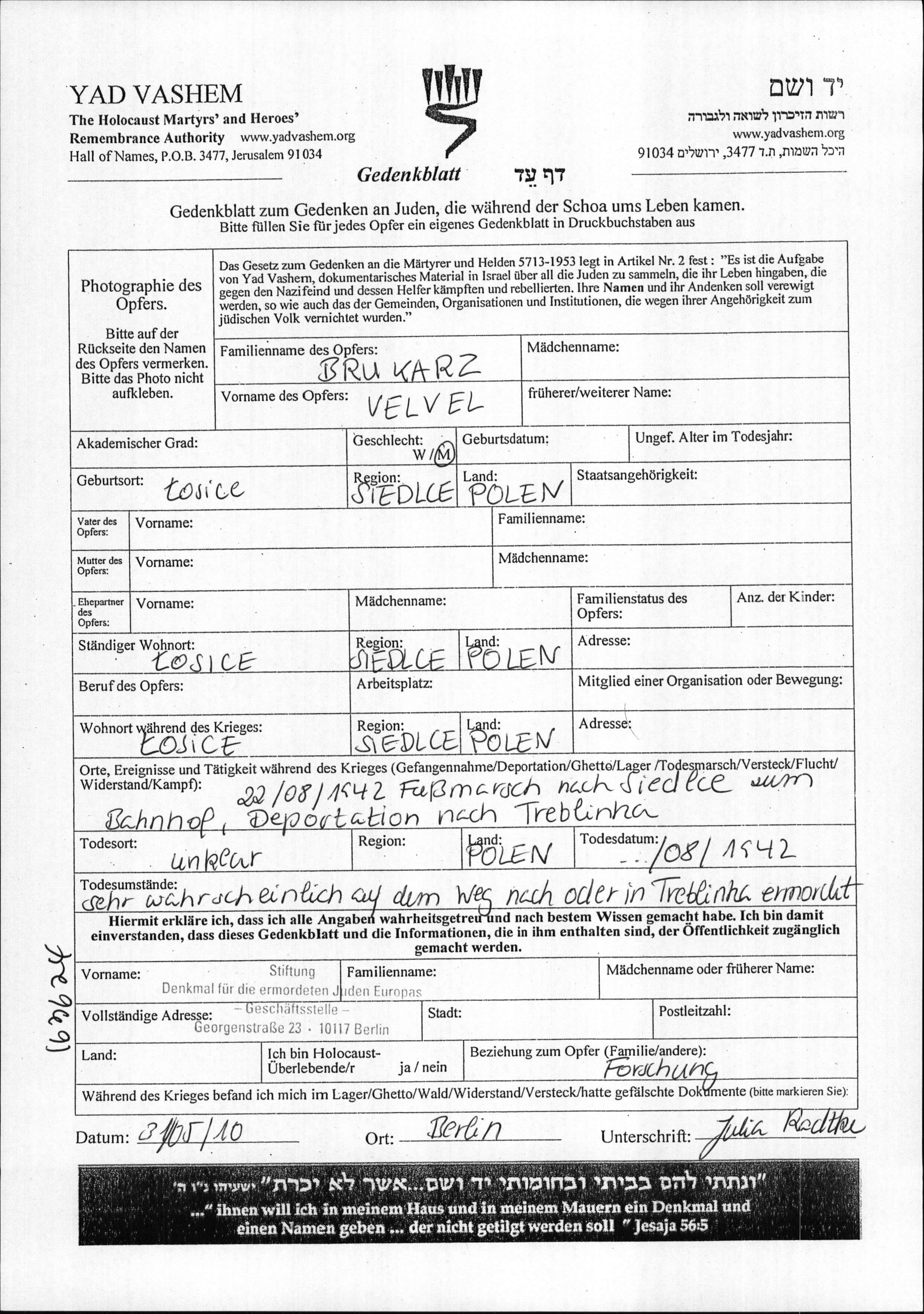Velvel Brukarz was born in Losice, Poland. Prior to WWII he lived in Losice, Poland. During the war he was in Losice, Poland. Velvel was murdered in the Shoah. Place of death: Treblinka, Poland, 08/1942.