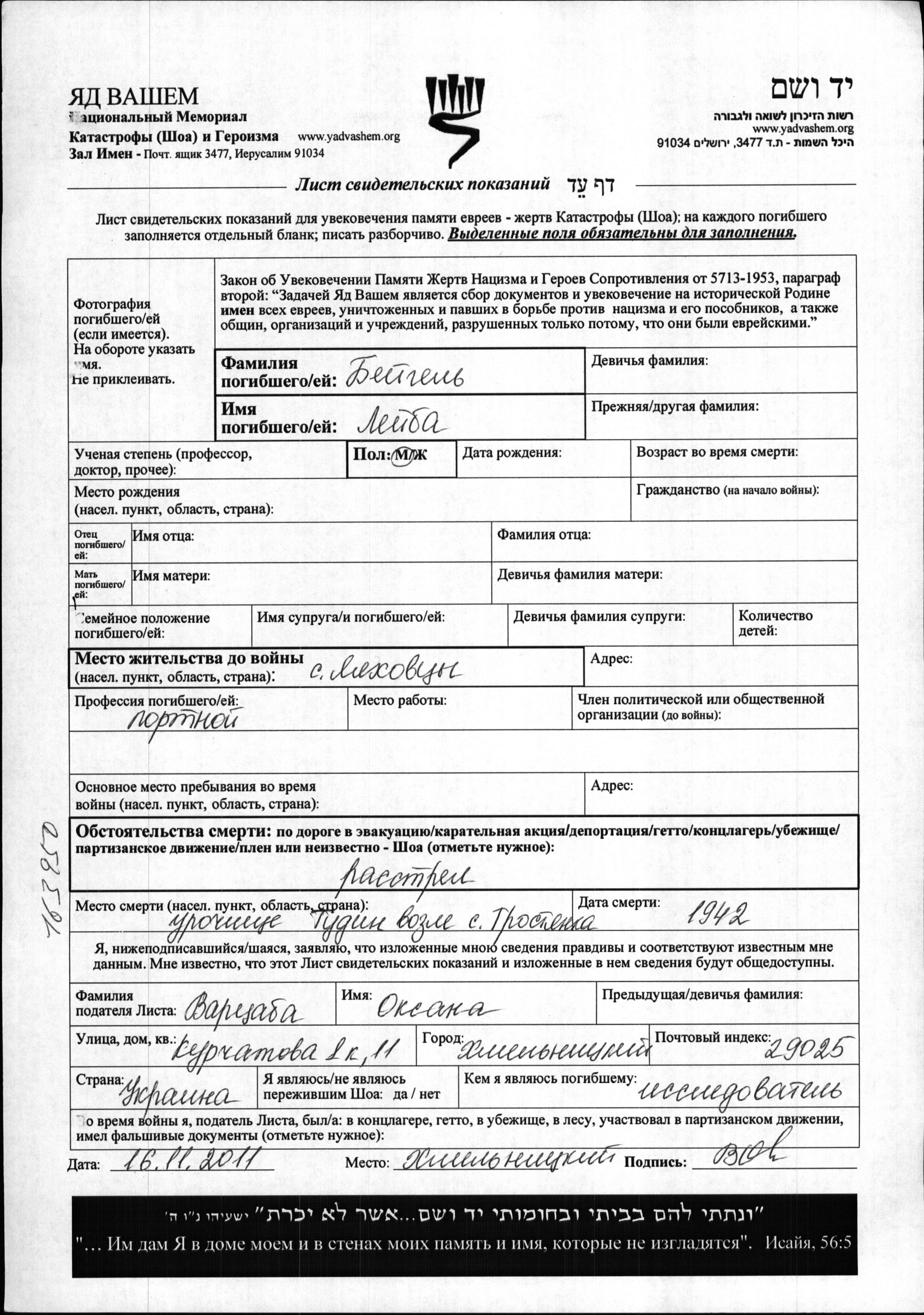 Beygel Leyba Lyakhovtsy, Ukraine (USSR) Page of Testimony