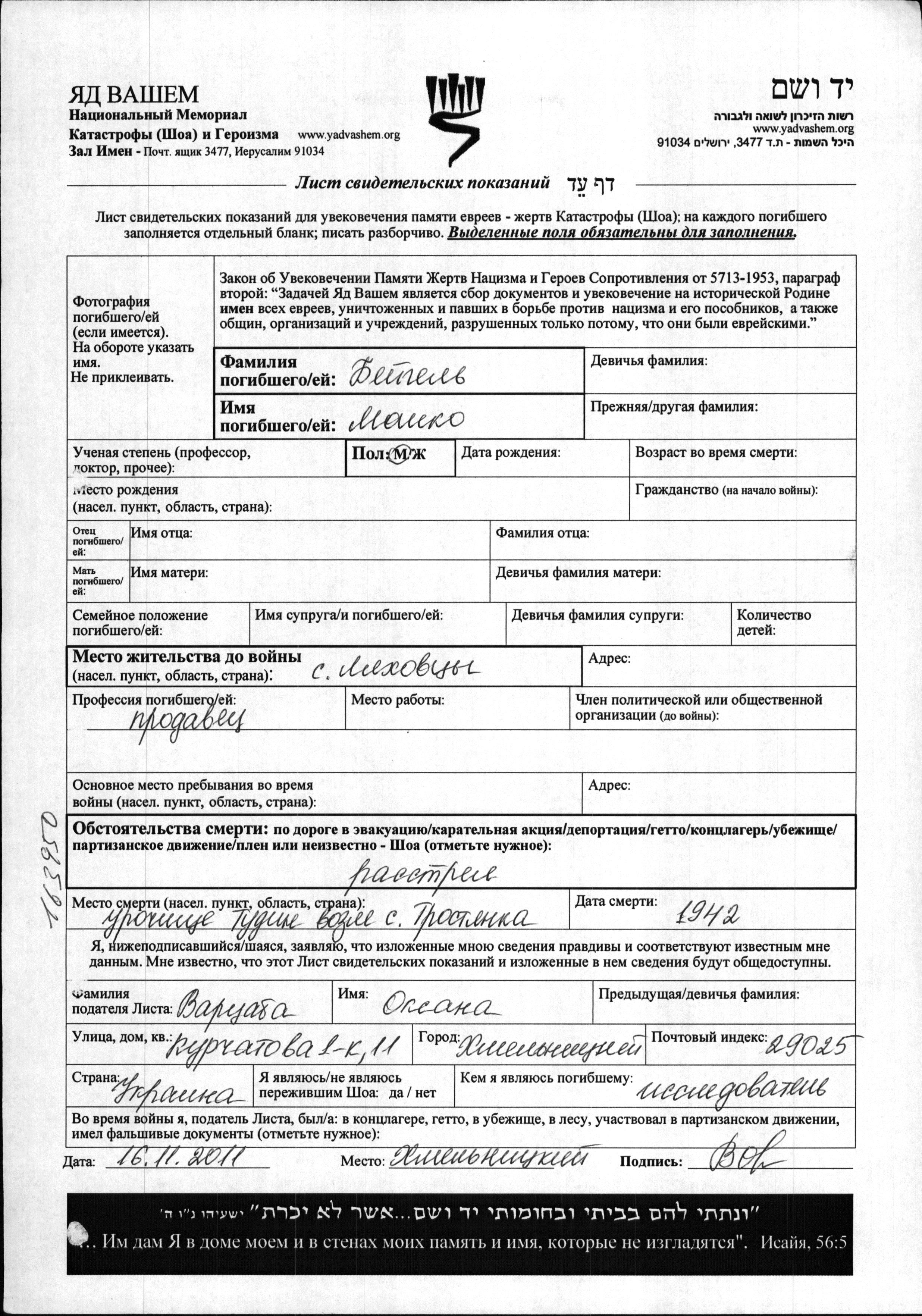Beygel Moshko Lyakhovtsy, Ukraine (USSR) Page of Testimony
