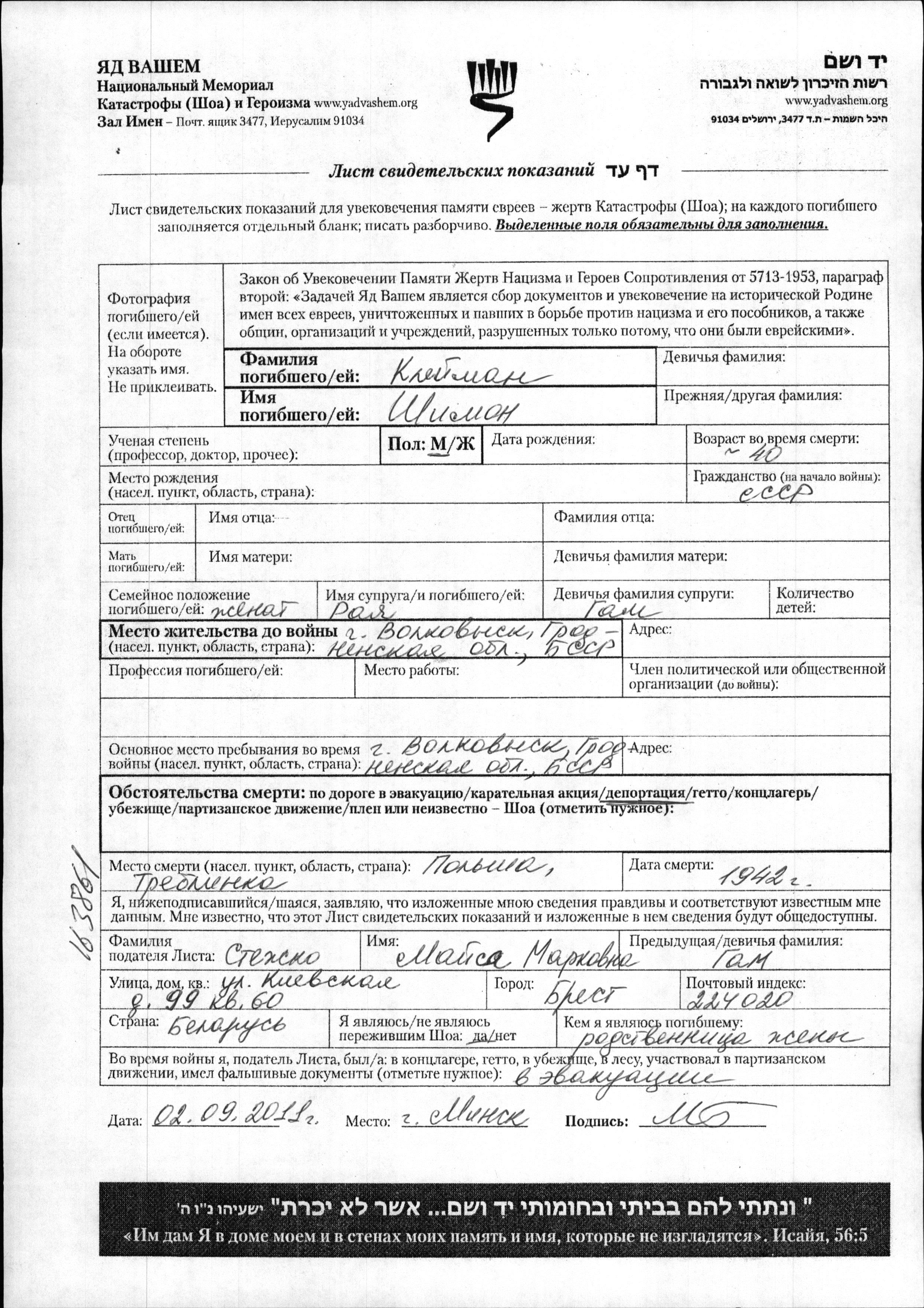 Yad Vashem - Pages of Testimony Names Memorial Collection