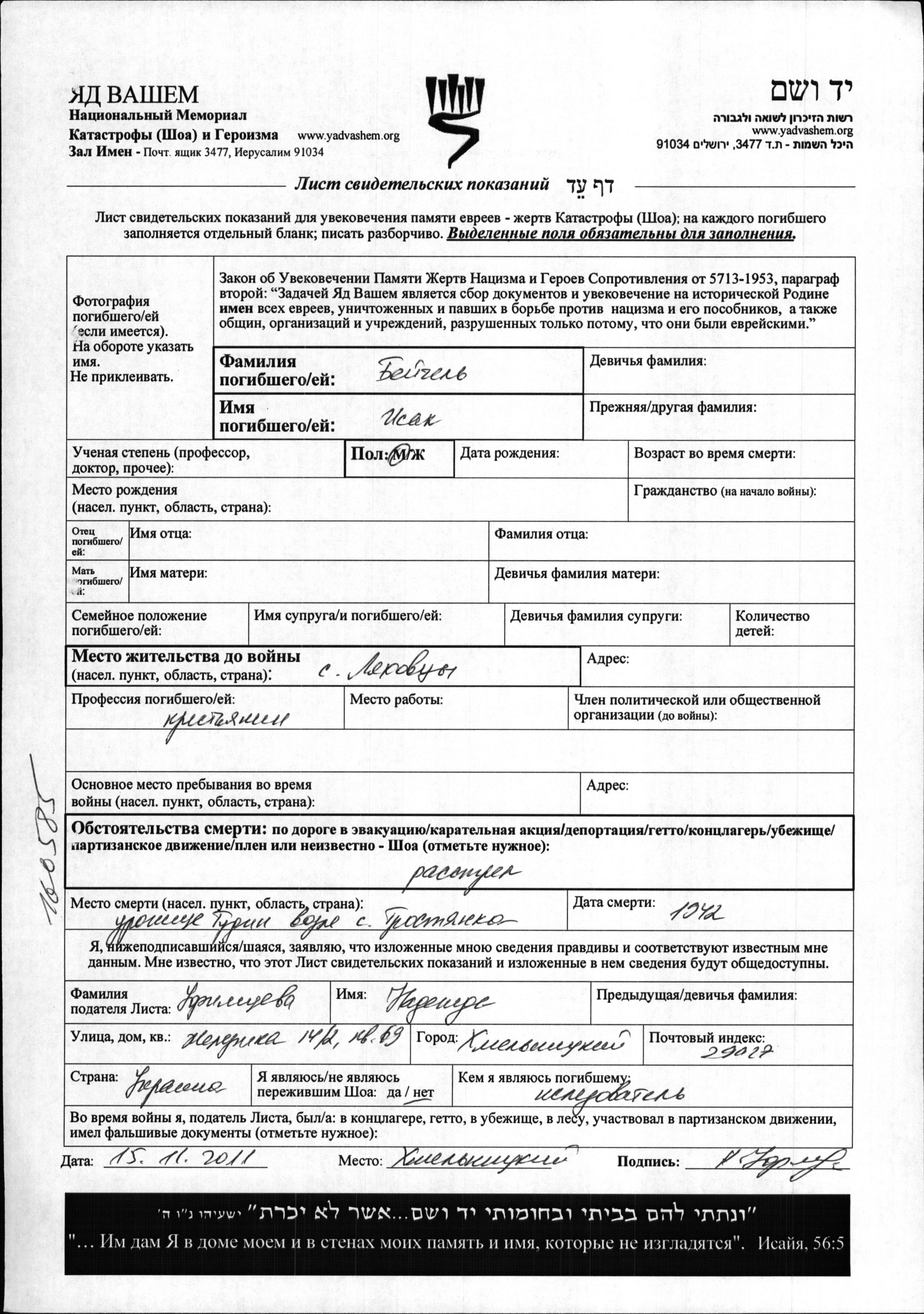 Beygel Isak Lyakhovtsy, Ukraine (USSR) Page of Testimony