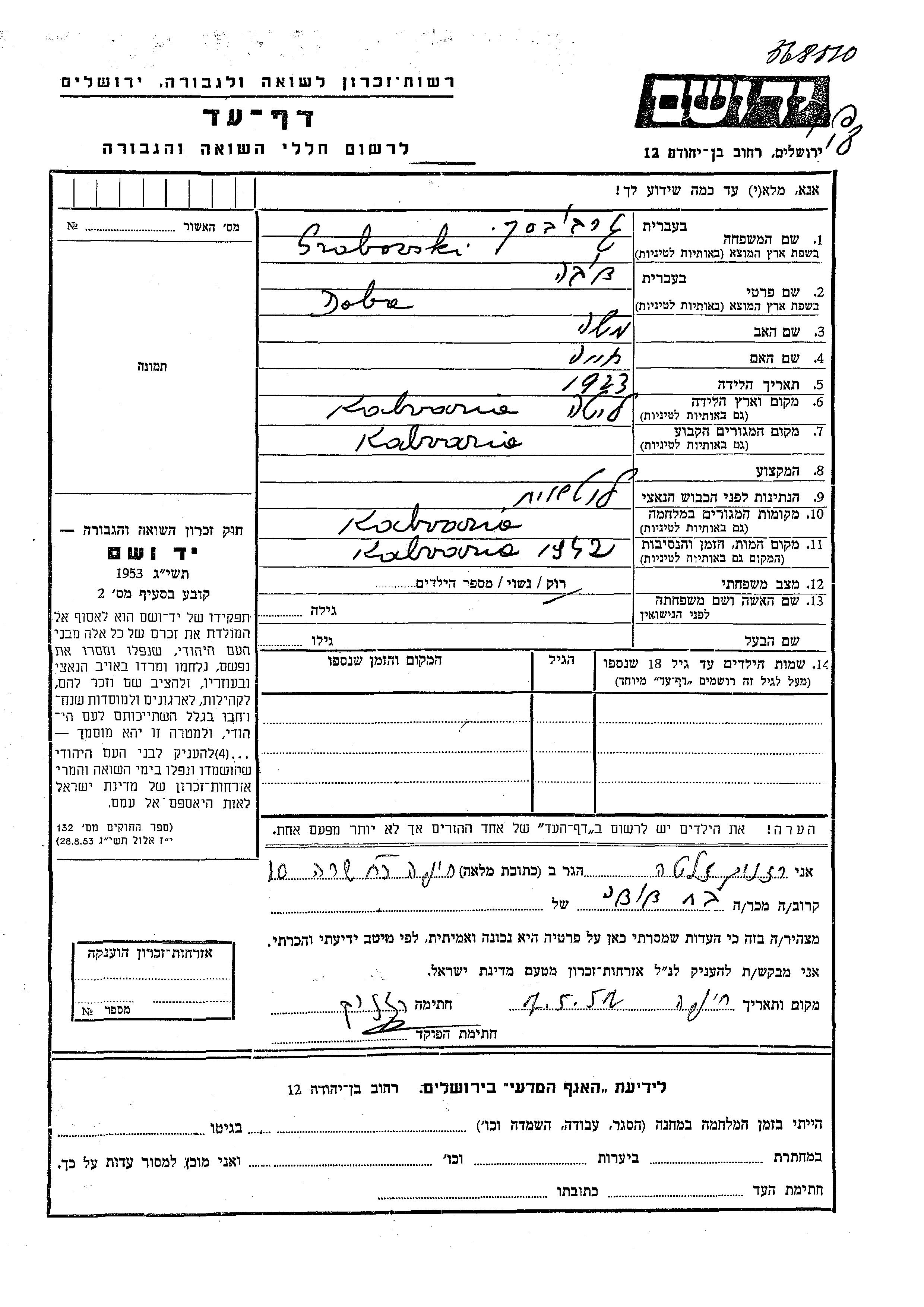 Doba Grobovski was born in Kalvaria, Lithuania, 1923 to Moshe and Khaia. She was single. Prior to WWII she lived in Kalvaria, Lithuania. During the war she was in Kalvaria, Lithuania. Doba was murdered in the Shoah. Place of death: Kalvaria, Lithuania, 1942.