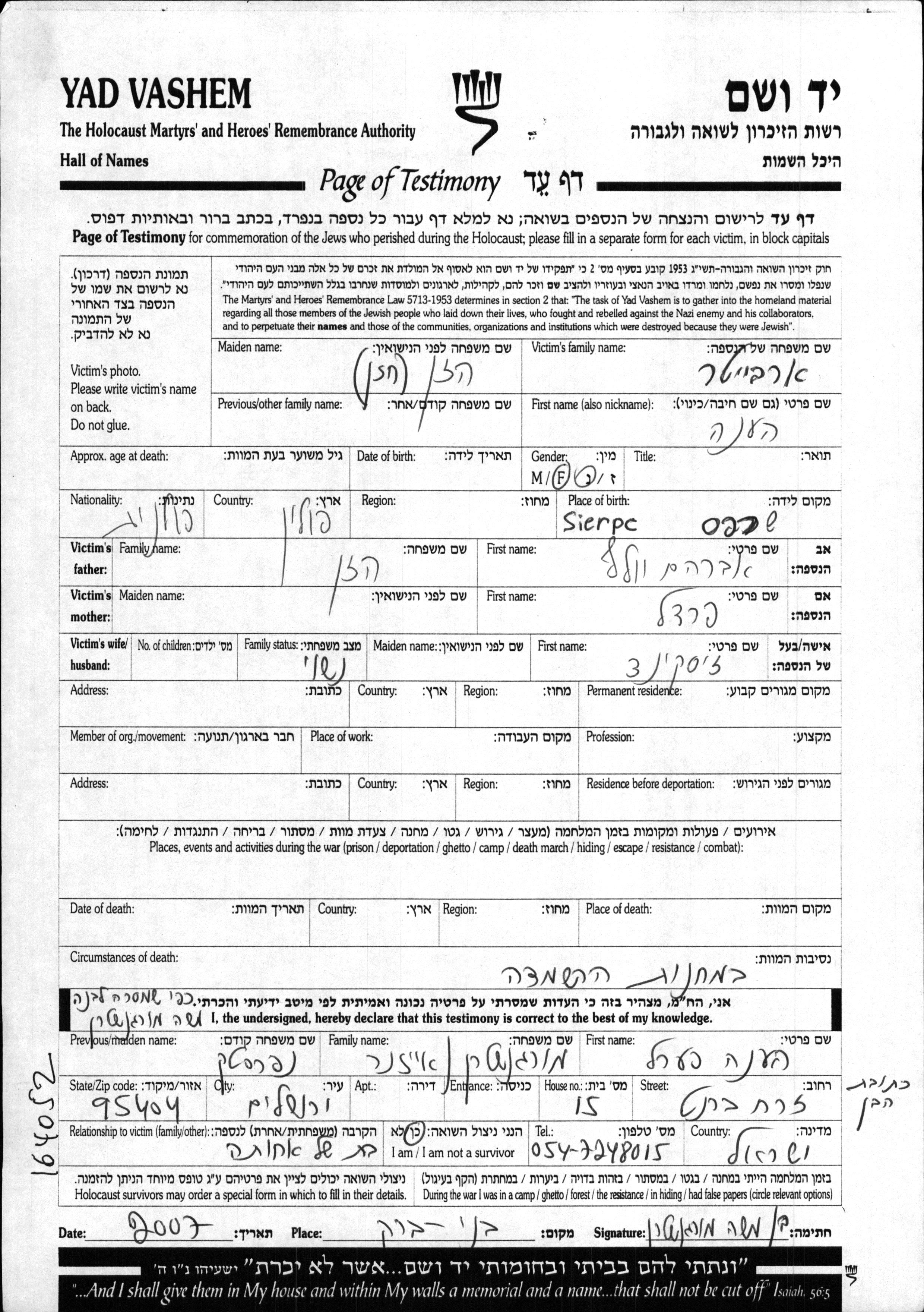 Arbeiter Khena unstated place, Page of Testimony