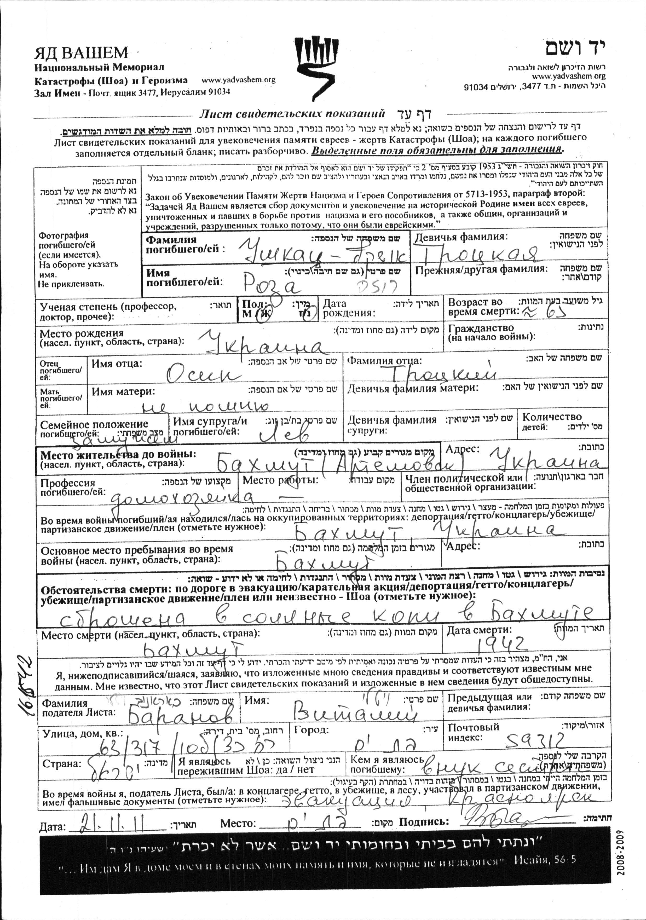 Ushkatz Roza Bakhmut, Ukraine (USSR) Page of Testimony