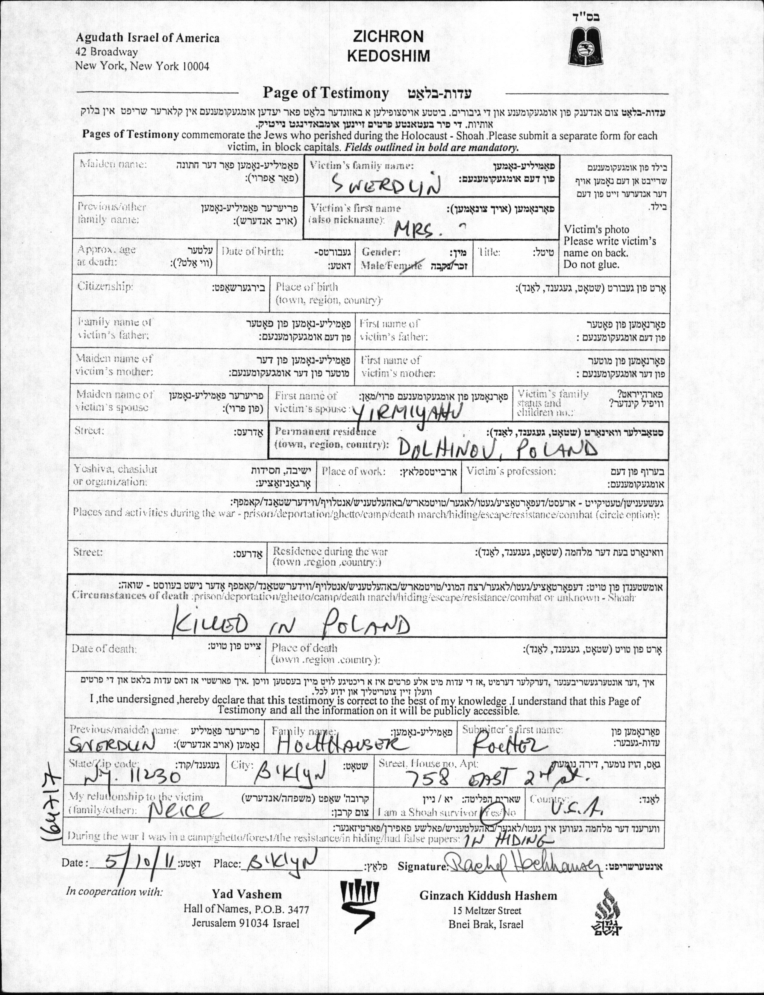 Swerdlin First name unknown Dolhinov, Poland Page of Testimony