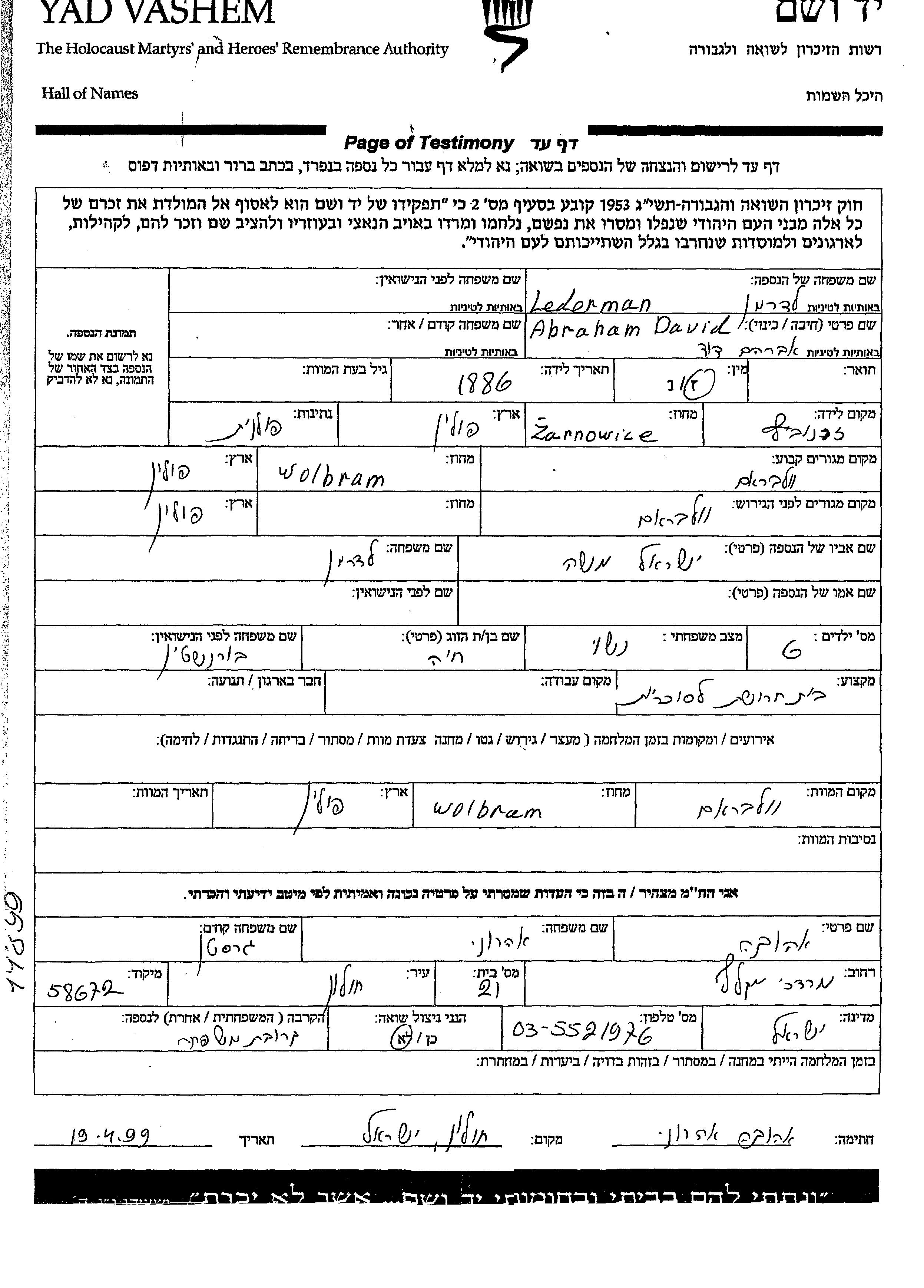 Abraham David Lederman was born in Zarnowiec, Poland, 1886 to Yisrael Moshe. He was married to Khaia nee Bornshtein. Prior to WWII he lived in Wolbrom, Poland. During the war he was in Wolbrom, Poland. Abraham David was murdered in the Shoah. Place of death: Wolbrom, Poland.