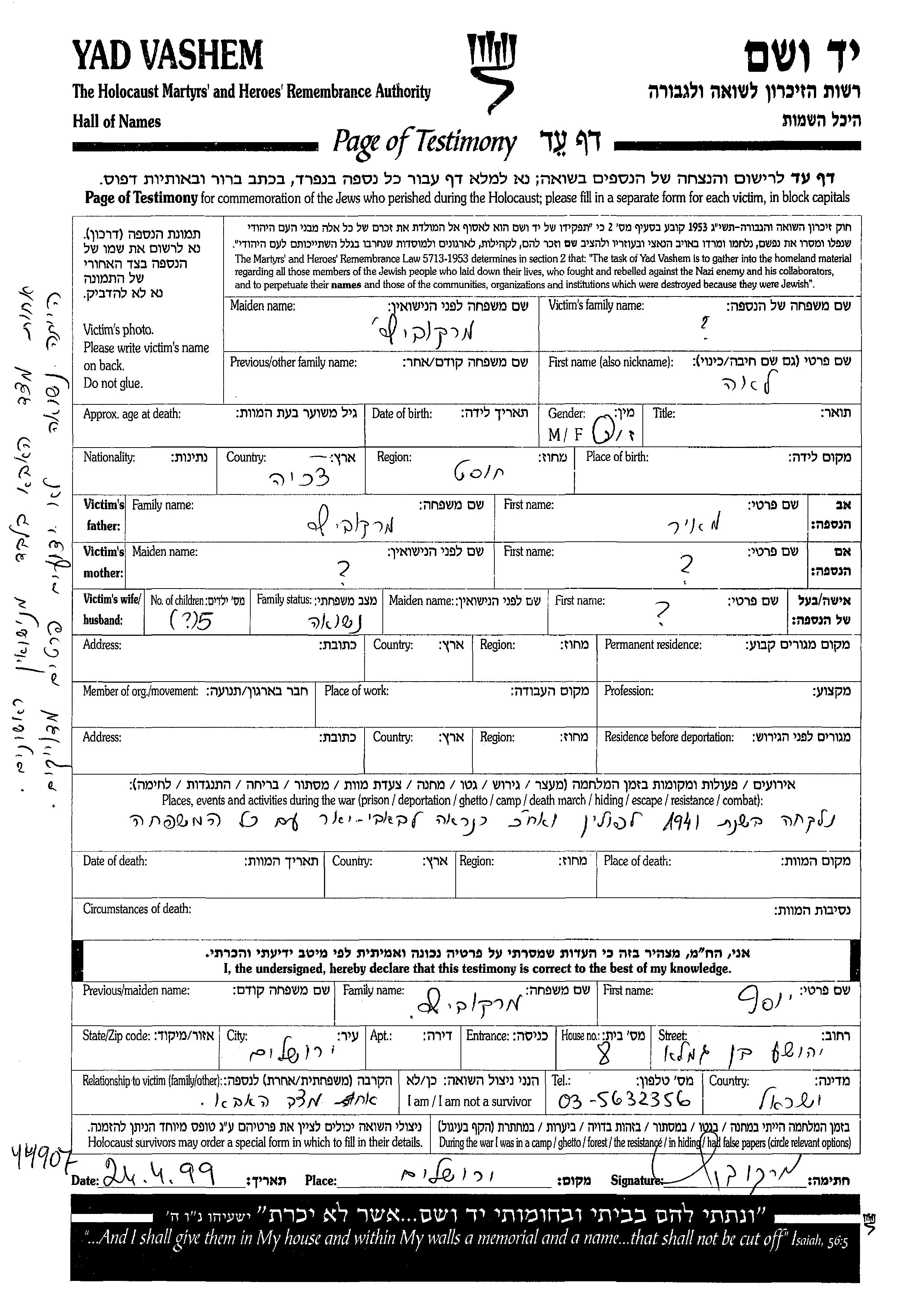 Yad Vashem - Pages of Testimony Names Memorial Collection