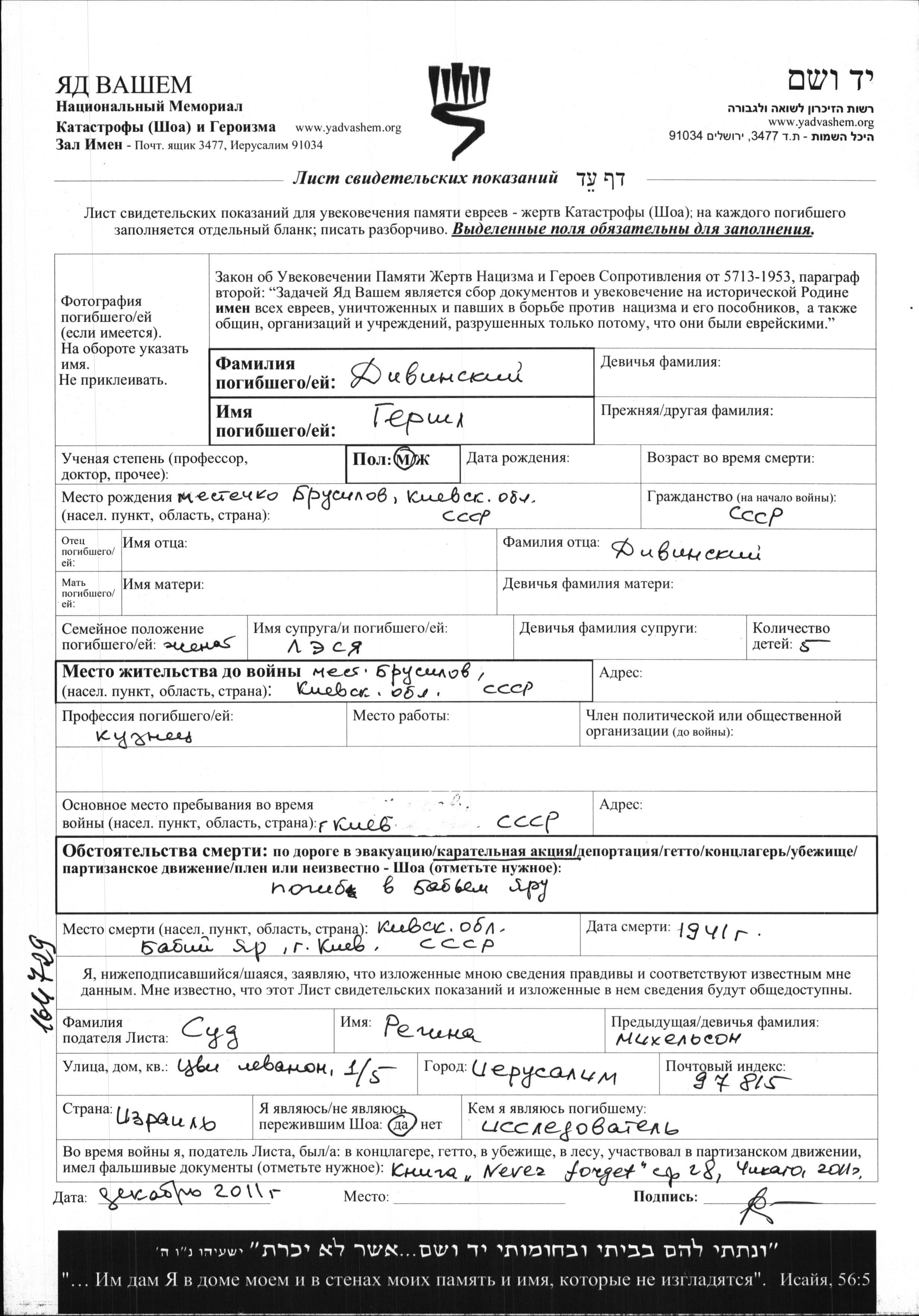 Gershl Divinski was born in Brusilov, Ukraine (USSR). He was a blacksmith and married to Lesya. Prior to WWII he lived in Brusilov, Ukraine (USSR). During the war he was in Kiev, Ukraine (USSR). Gershl was murdered in the Shoah. Place of death: Babi Yar, Ukraine (USSR), 1941.