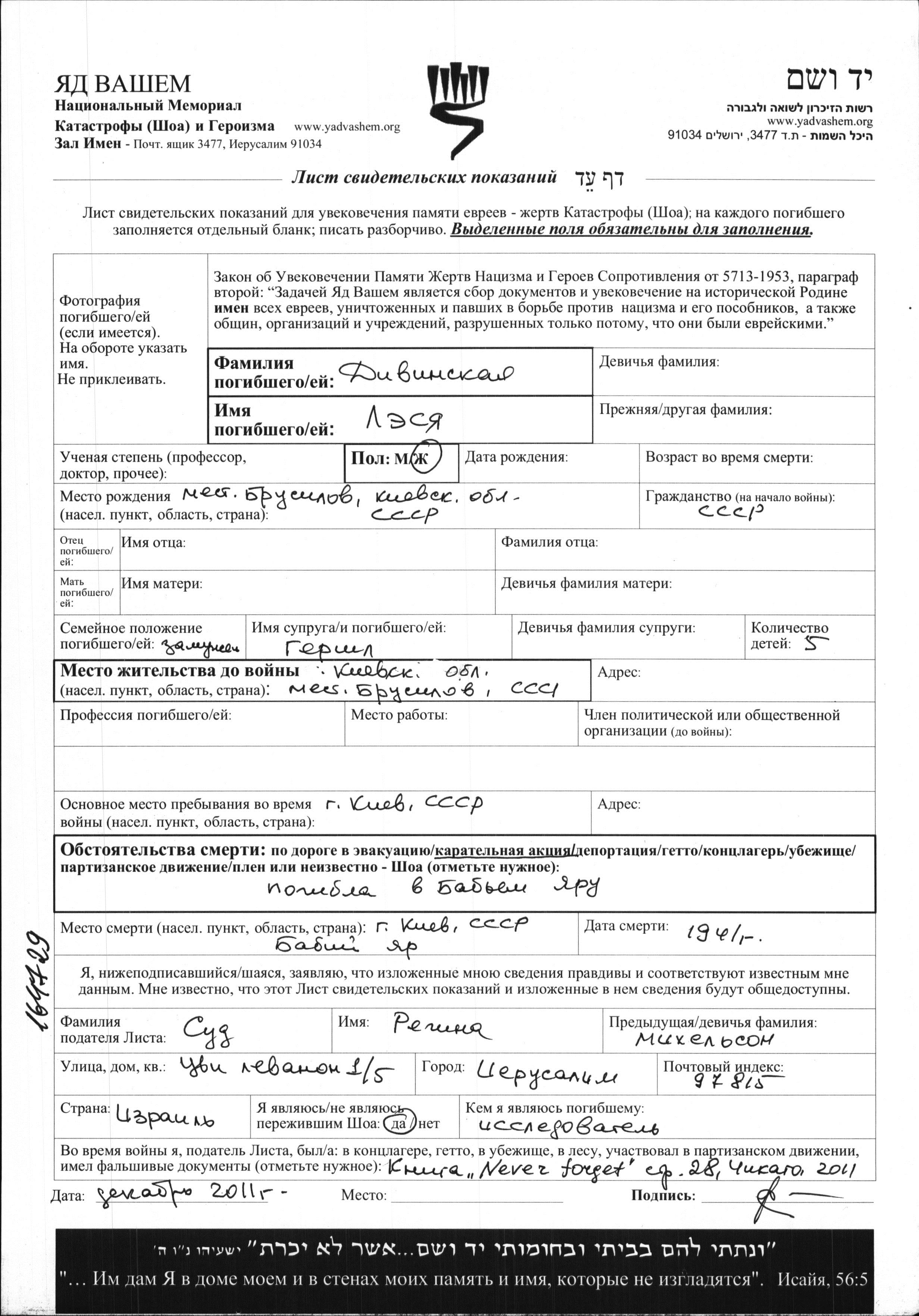 Lesya Divinskaya was born in Brusilov, Ukraine (USSR). She was married to Gershl. Prior to WWII she lived in Brusilov, Ukraine (USSR). During the war she was in Kiev, Ukraine (USSR). Lesya was murdered in the Shoah. Place of death: Babiy Yar (Kiev), Ukraine (USSR), 1941.