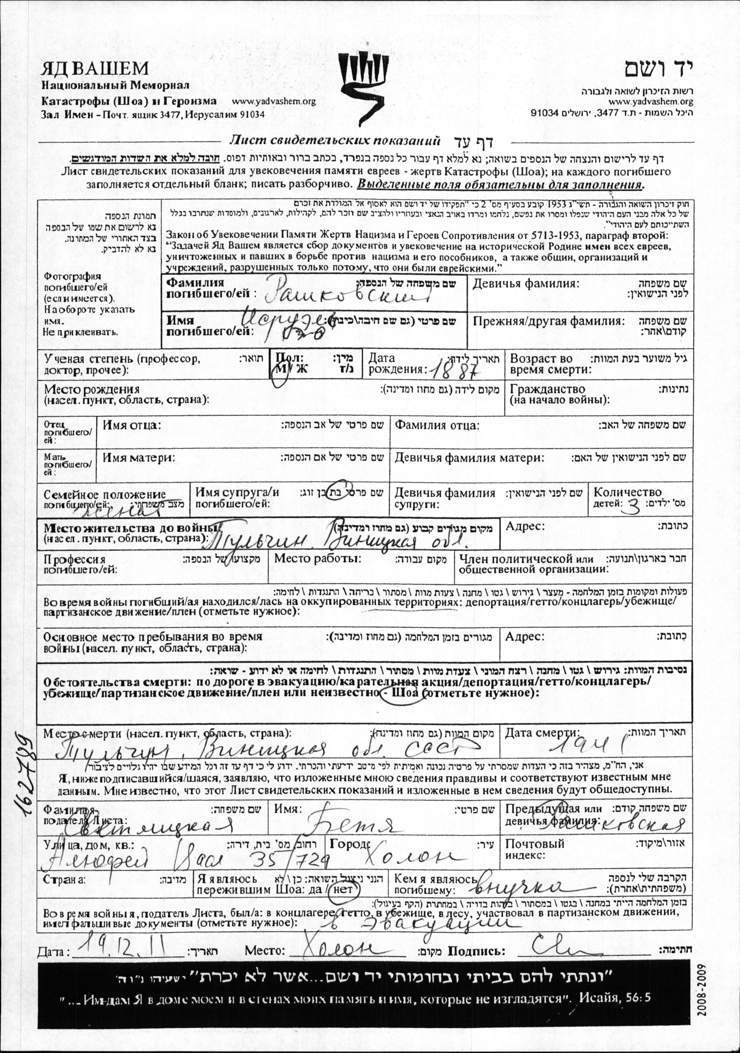 Rashkovski Isruel 1887 Tulchin, Ukraine (USSR) Page of Testimony