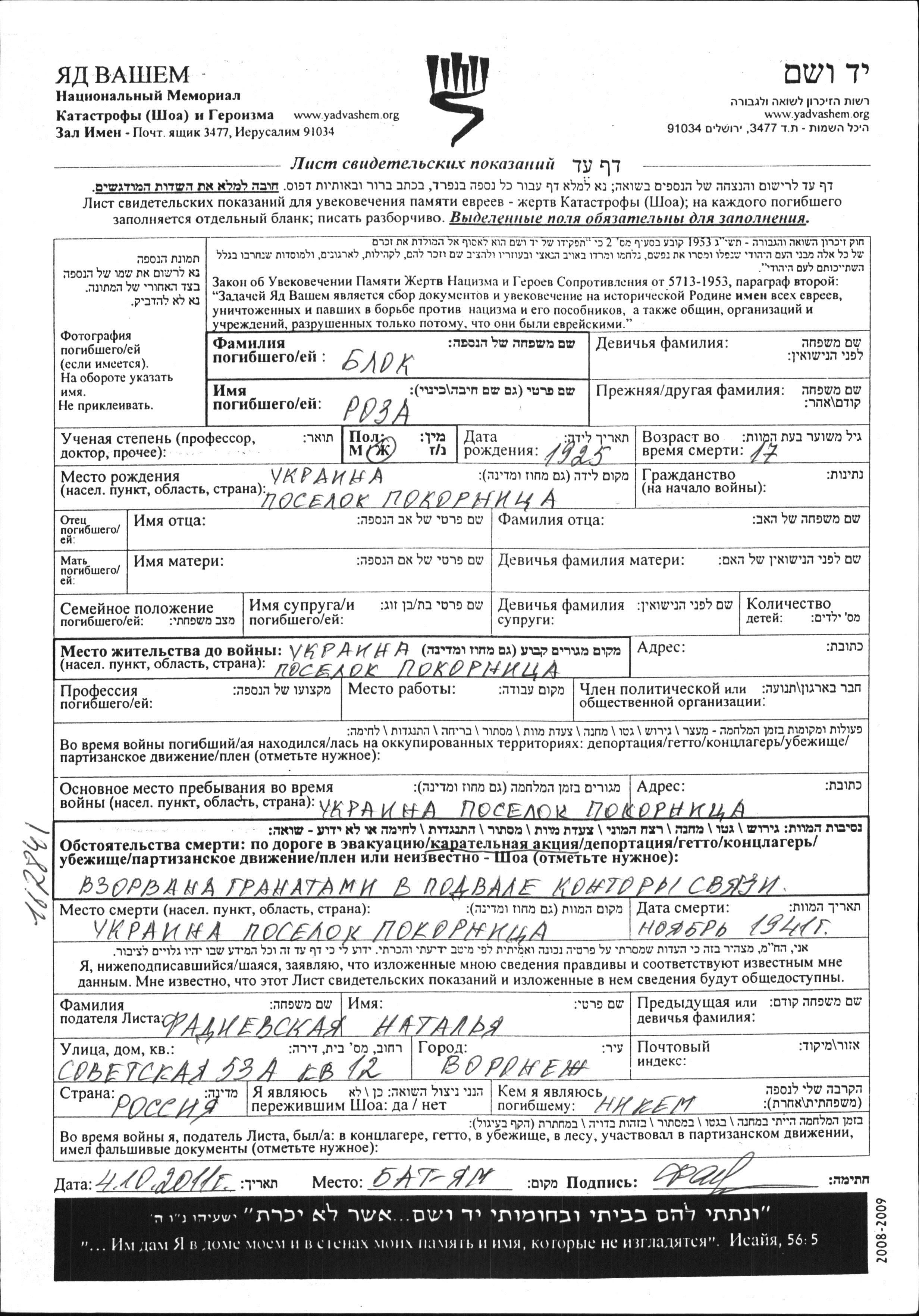 Roza Blok was born in Ponornitsa, Ukraine (USSR), 1925. She was teenager. Prior to WWII she lived in Ponornitsa, Ukraine (USSR). During the war she was in Ponornitsa, Ukraine (USSR). Roza was murdered in the Shoah. Place of death: Ponornitsa, Ukraine (USSR), 11/1941.