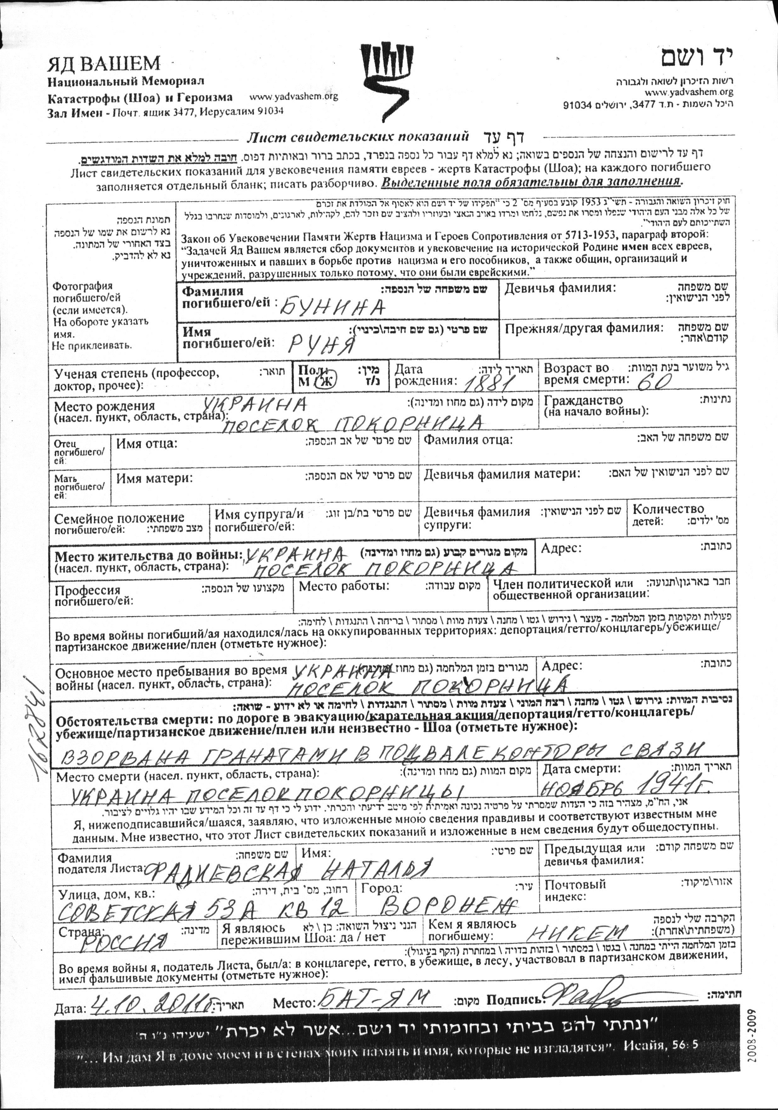 Runya Bunina was born in Ponornitsa, Ukraine (USSR), 1881. Prior to WWII she lived in Ponornitsa, Ukraine (USSR). During the war she was in Ponornitsa, Ukraine (USSR). Runya was murdered in the Shoah. Place of death: Ponornitsa, Ukraine (USSR), 11/1941.