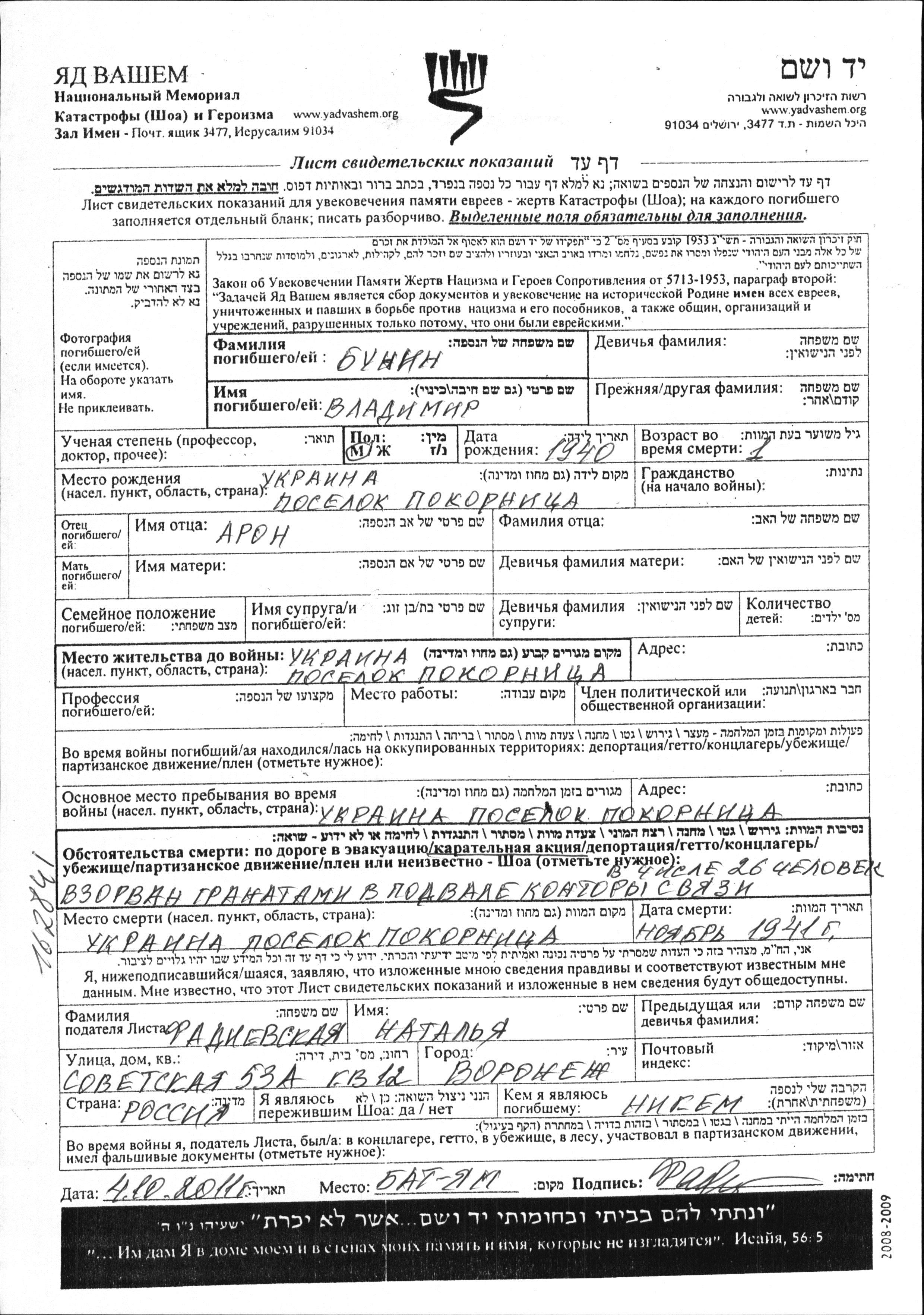 Vladimir Bunin was born in Ponornitsa, Ukraine (USSR), 1940 to Aron. He was child. Prior to WWII he lived in Ponornitsa, Ukraine (USSR). During the war he was in Ponornitsa, Ukraine (USSR). Vladimir was murdered in the Shoah. Place of death: Ponornitsa, Ukraine (USSR), 11/1941.