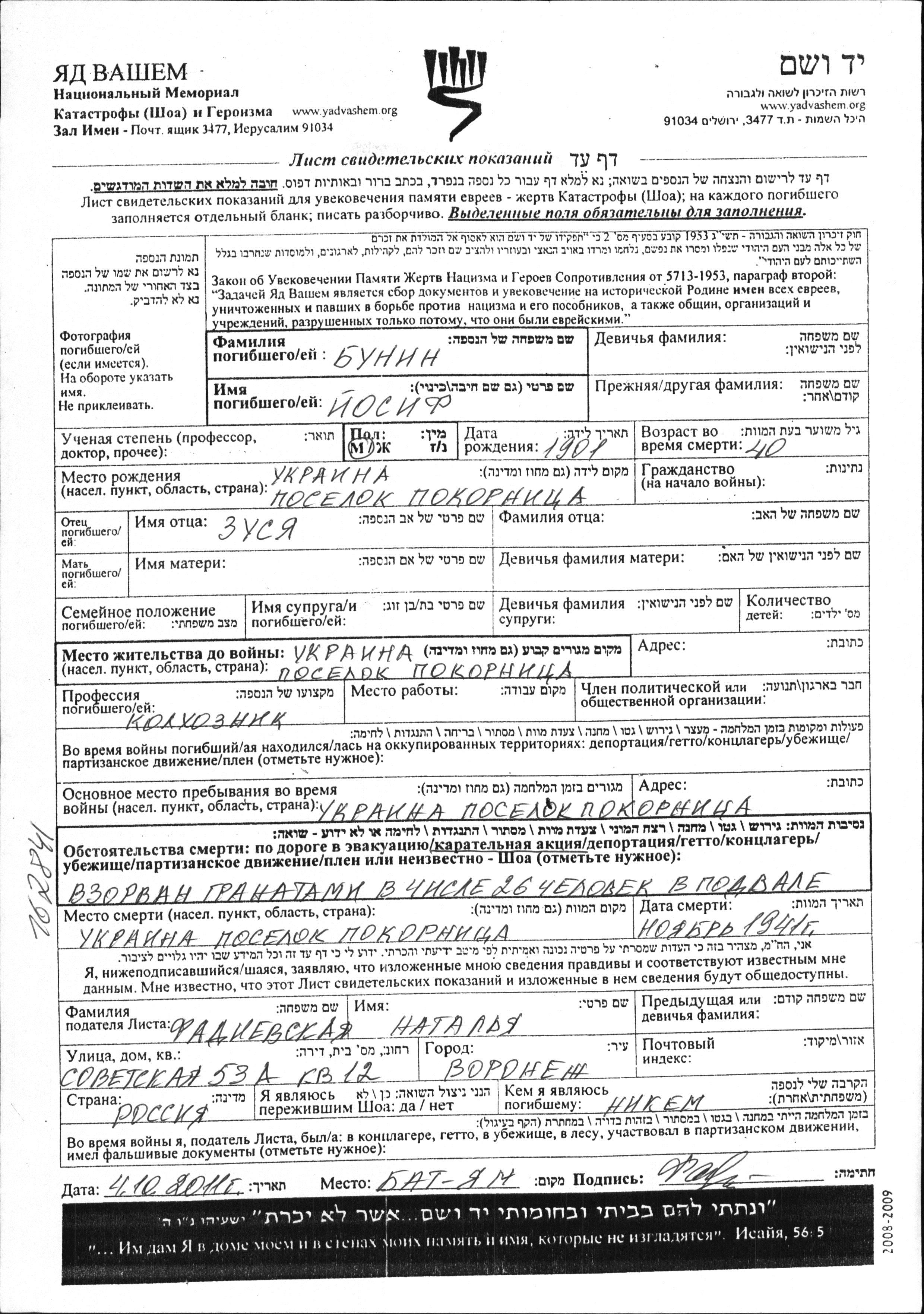 Yosif Bunin was born in Ponornitsa, Ukraine (USSR), 1901 to Zusya. He was a kolkhoznik / kolkhoznitza. Prior to WWII he lived in Ponornitsa, Ukraine (USSR). During the war he was in Ponornitsa, Ukraine (USSR). Yosif was murdered in the Shoah. Place of death: Ponornitsa, Ukraine (USSR), 11/1941.