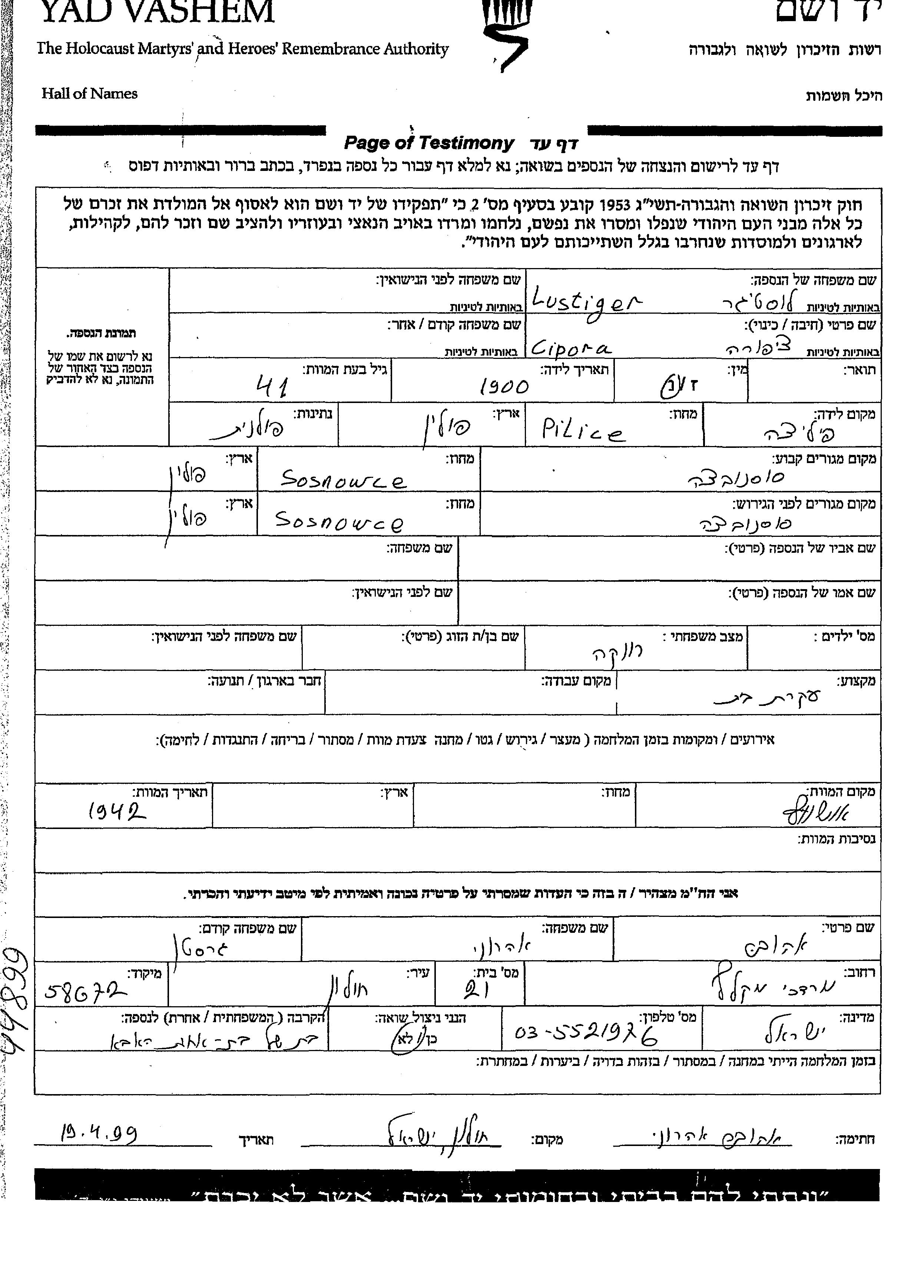 Cipora Lustiger was born in Pilica, Poland, 1900. She was a housewife and single. Prior to WWII she lived in Sosnowce, Poland. During the war she was in Sosnowce, Poland. Cipora was murdered in the Shoah. Place of death: Oshvitzin, Poland, 1942.
