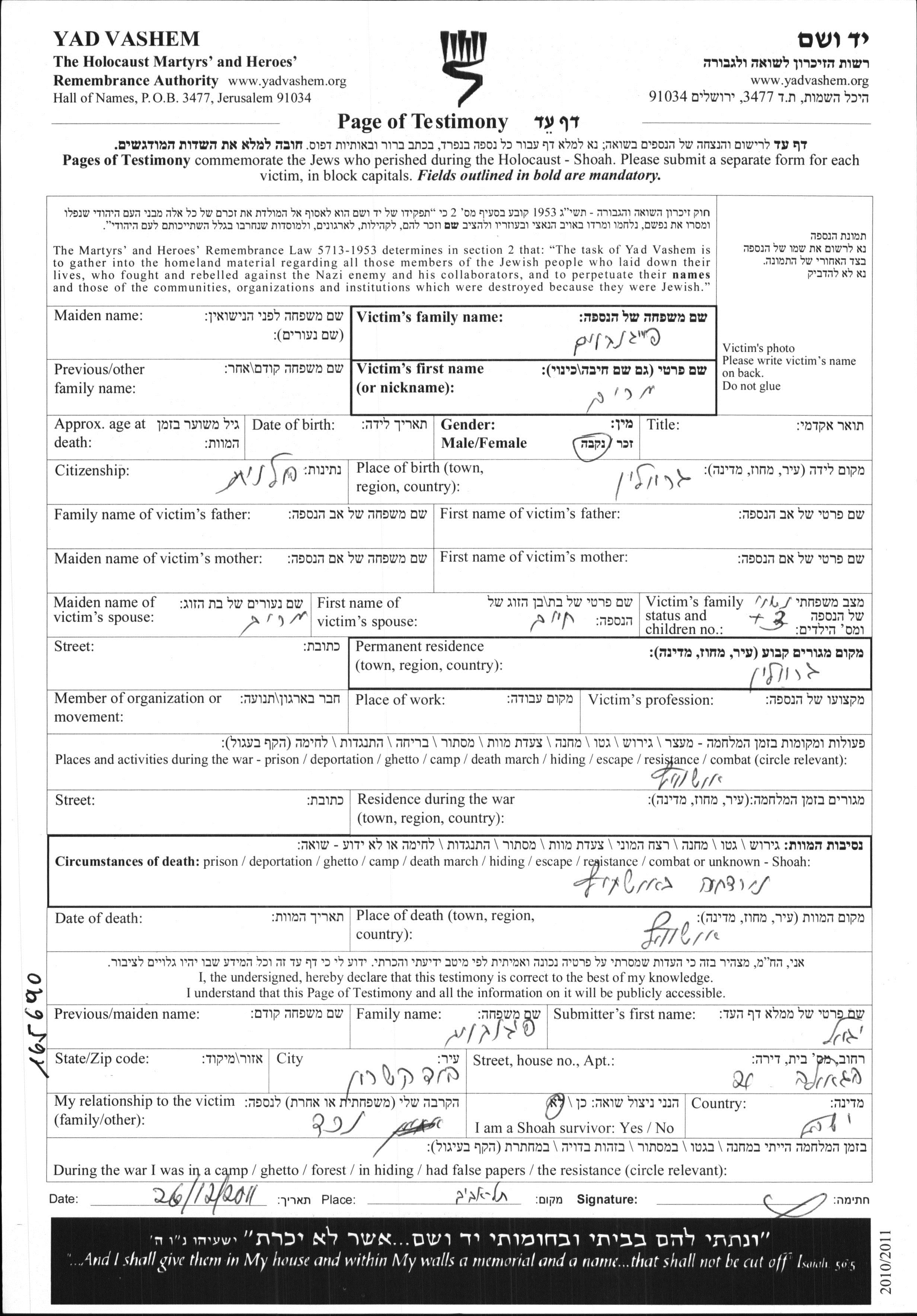 Miriam Feigenboim was born in Garwolin, Poland. She was married to Chaim. Prior to WWII she lived in Garwolin, Poland. During the war she was in Garwolin, Poland. Miriam was murdered in the Shoah. Place of death: Auschwitz, Poland.