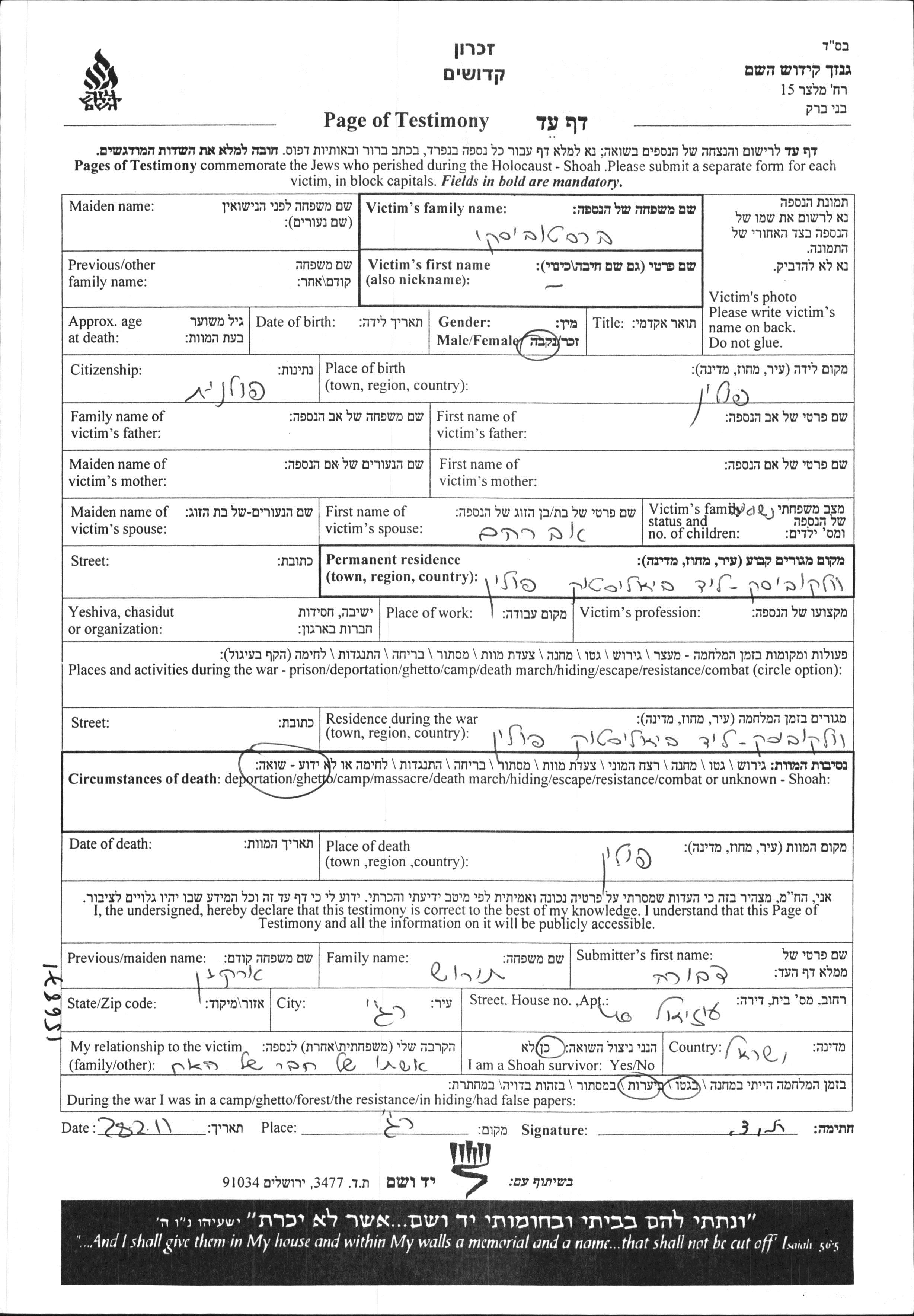 Yad Vashem - Pages of Testimony Names Memorial Collection