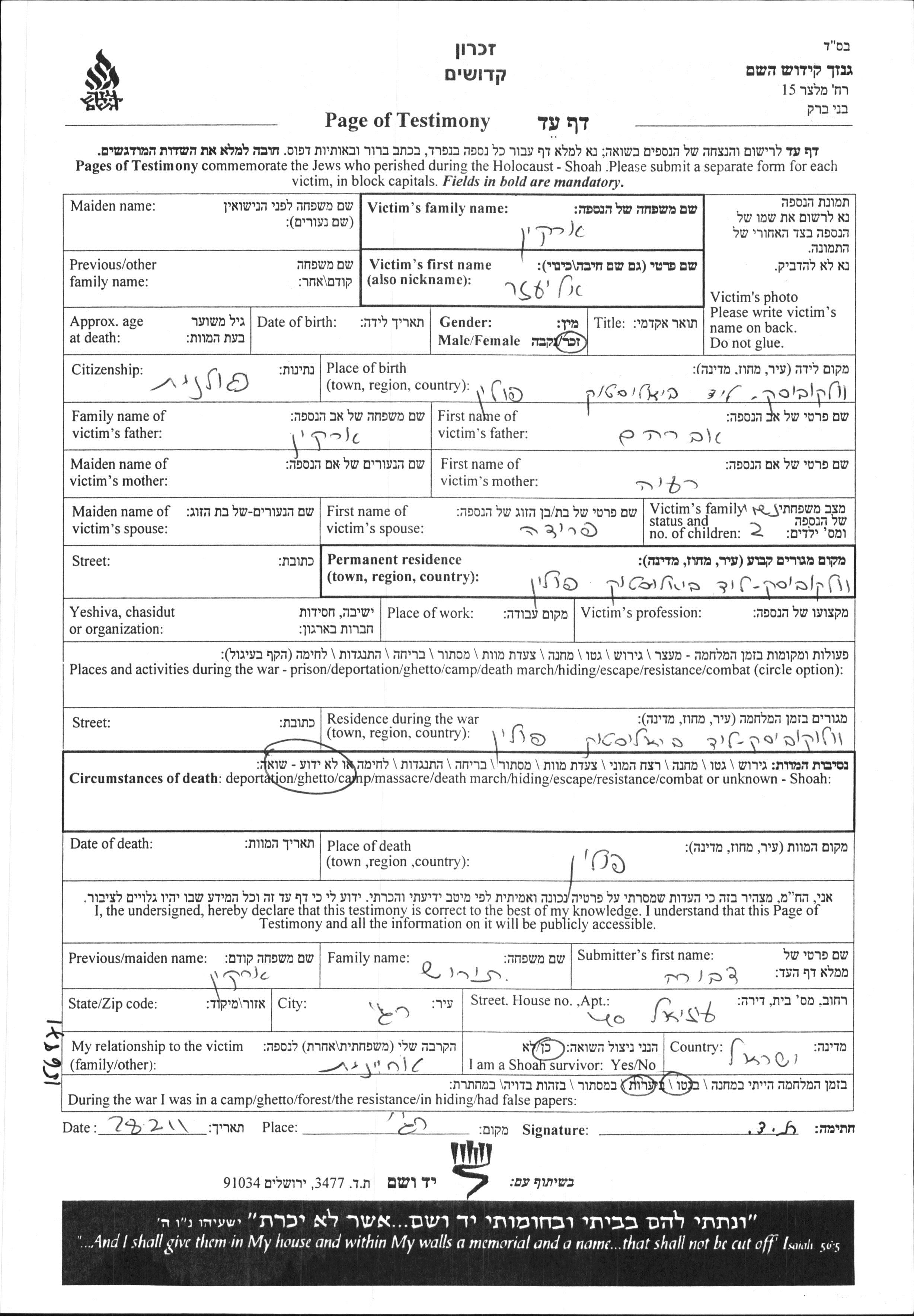 Yad Vashem - Pages of Testimony Names Memorial Collection