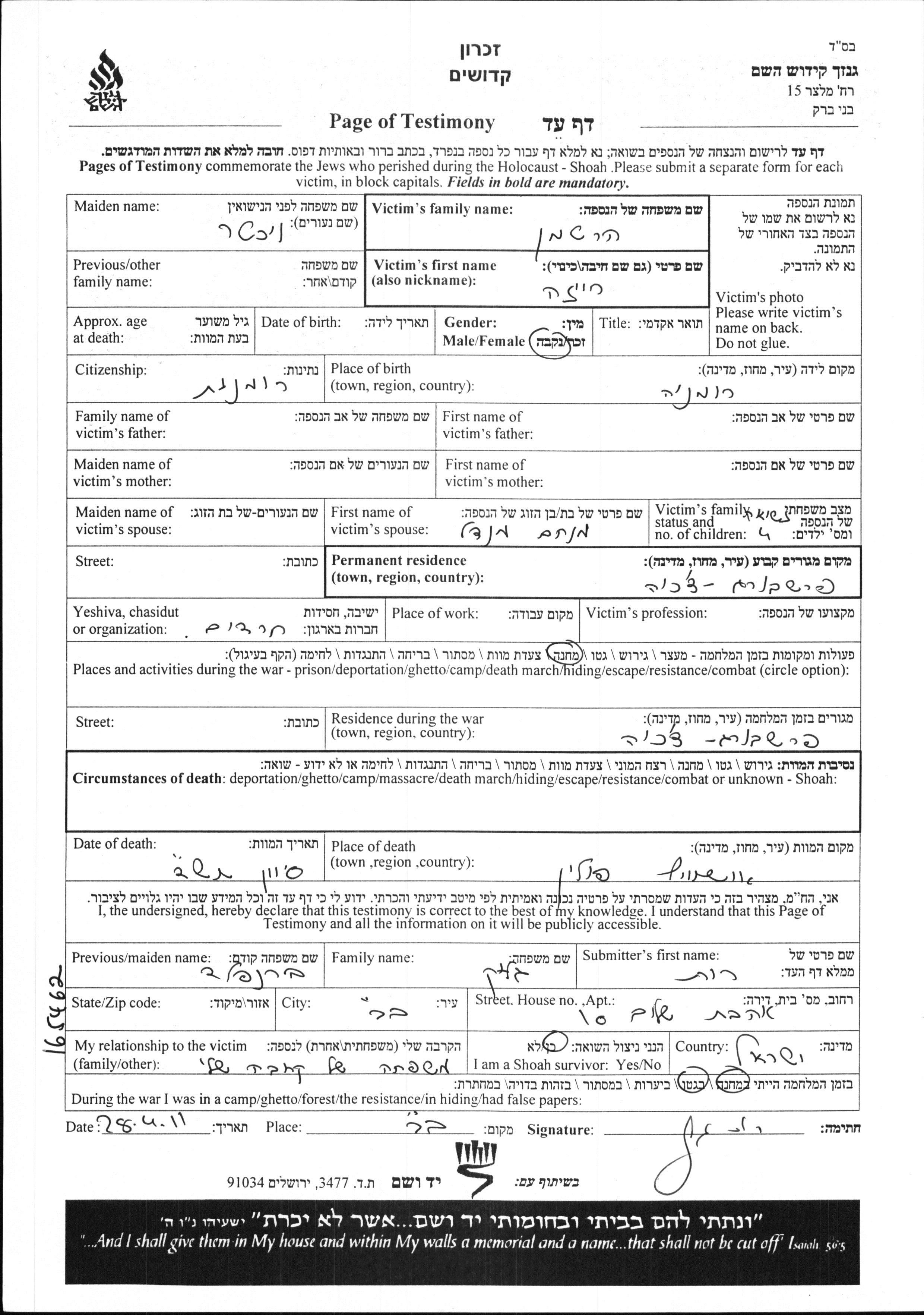 Yad Vashem - Pages of Testimony Names Memorial Collection