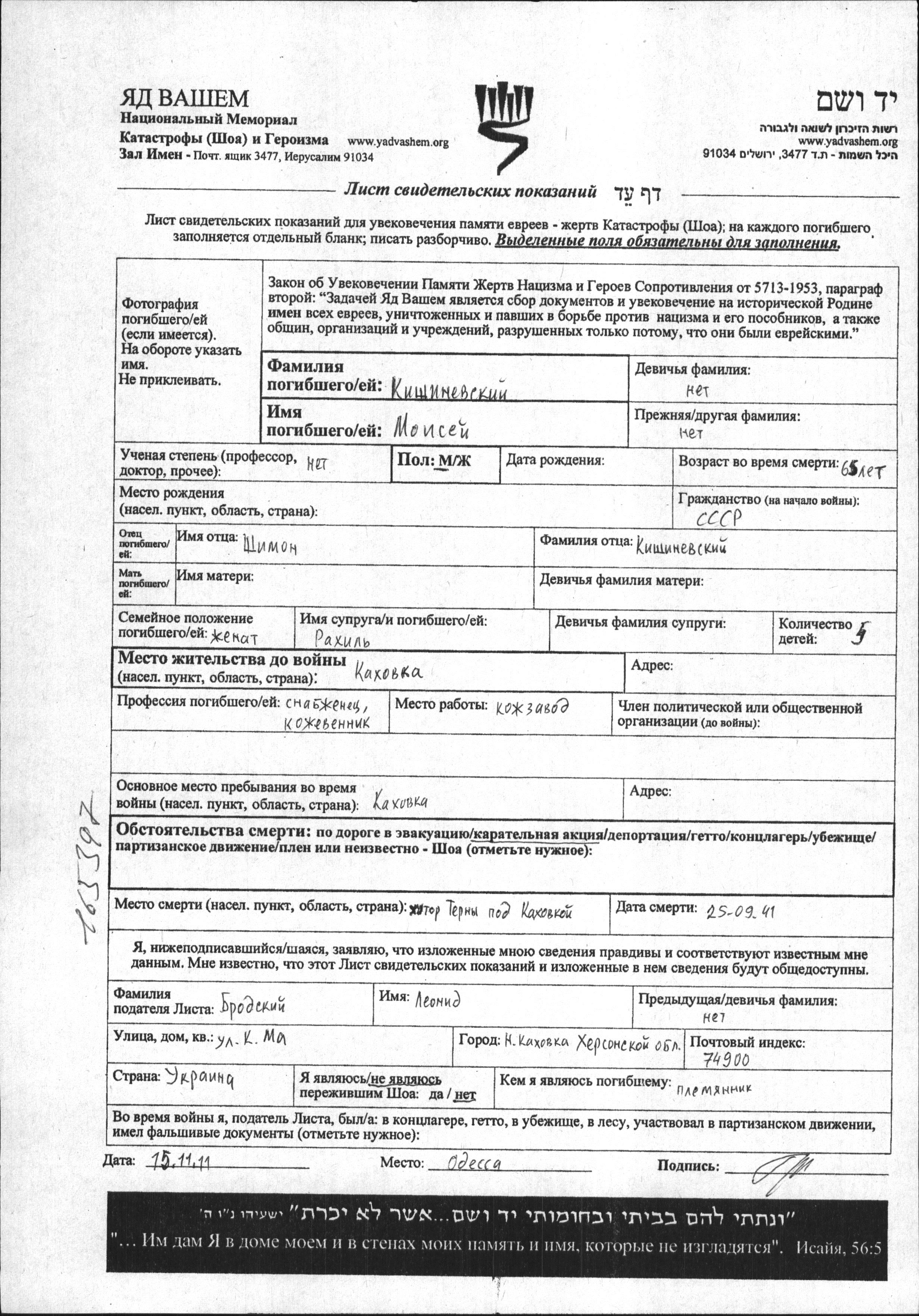 Kishinevskiy Moisey unstated place, Page of Testimony