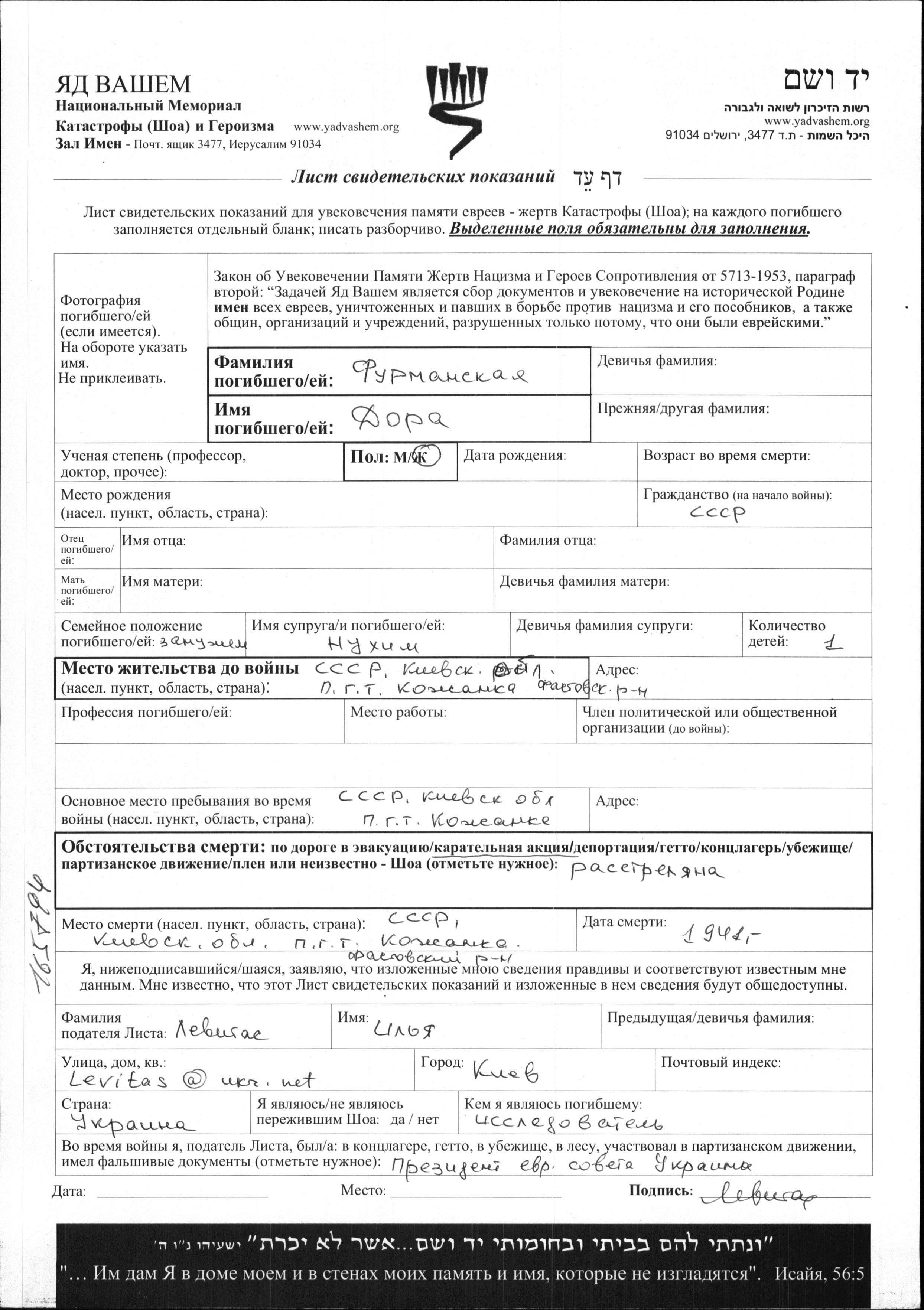 Dora Furmanskaya. She was married to Nukhim. Prior to WWII she lived in Kozhanka, Ukraine (USSR). During the war she was in Kozhanka, Ukraine (USSR). Dora was murdered in the Shoah. Place of death: Kozhanka, Ukraine (USSR), 1941.