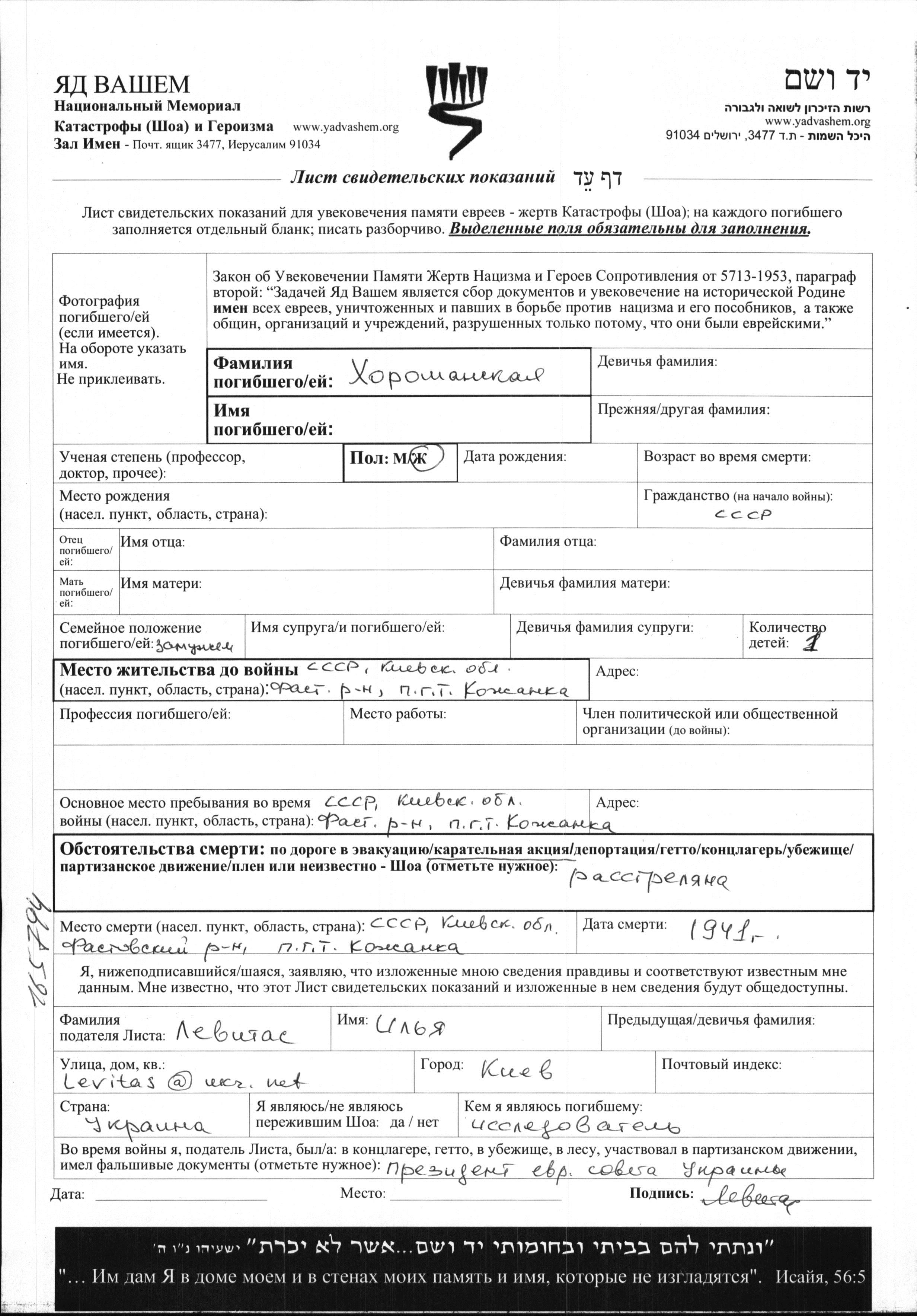 First name unknown Khoroshanskaya. She was married. Prior to WWII she lived in Kozhanka, Ukraine (USSR). During the war she was in Kozhanka, Ukraine (USSR). She was murdered in the Shoah. Place of death: Kozhanka, Ukraine (USSR), 1941.