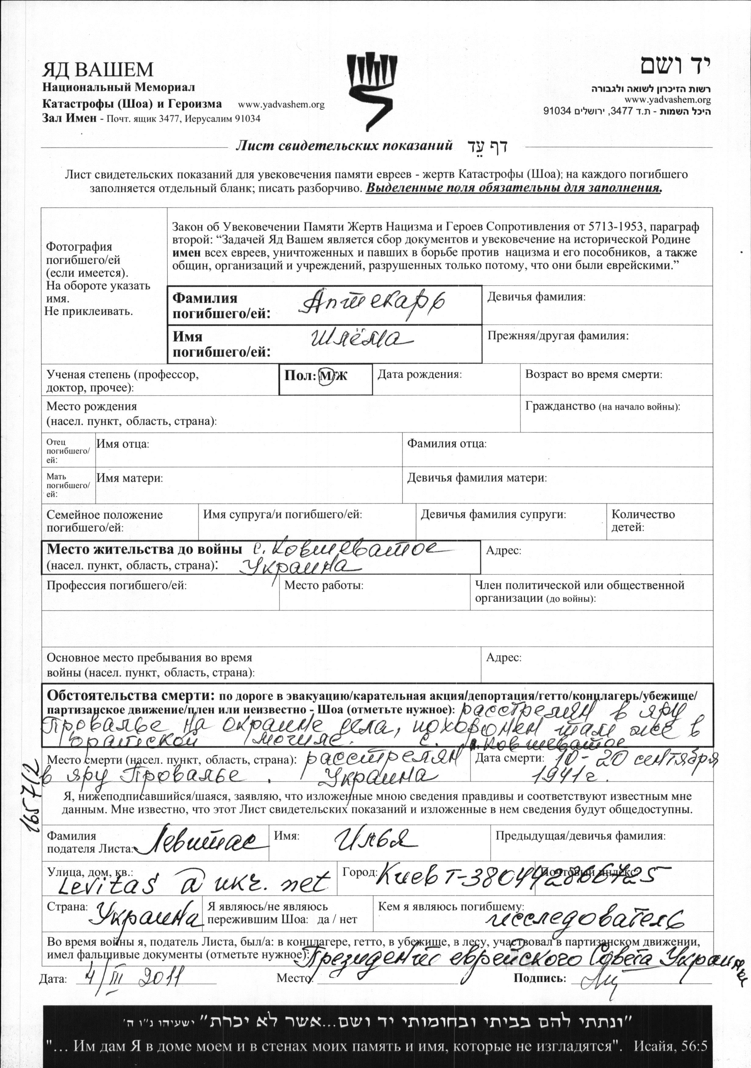 Aptekar Shlyoma Kovshevataya, Ukraine (USSR) Page of Testimony