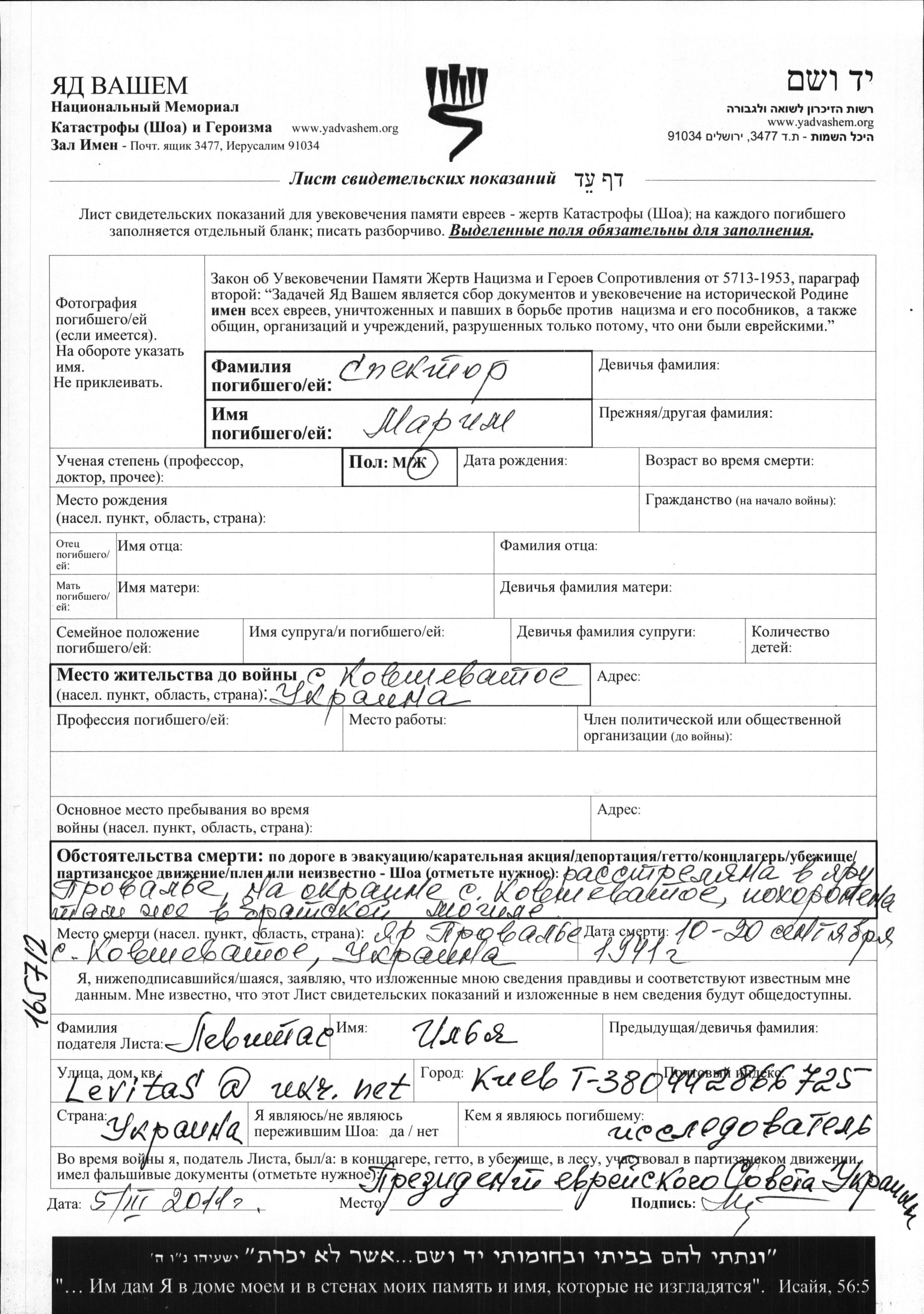 Spektor Marim Kovshevataya, Ukraine (USSR) Page of Testimony