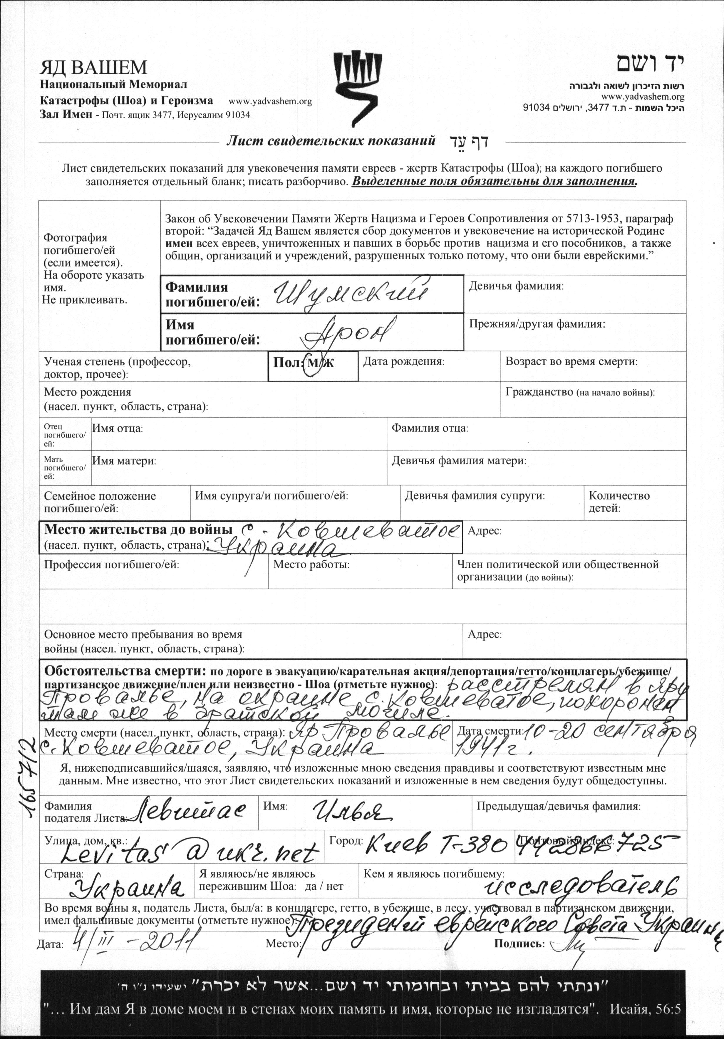 Shumski Aron Kovshevataya, Ukraine (USSR) Page of Testimony
