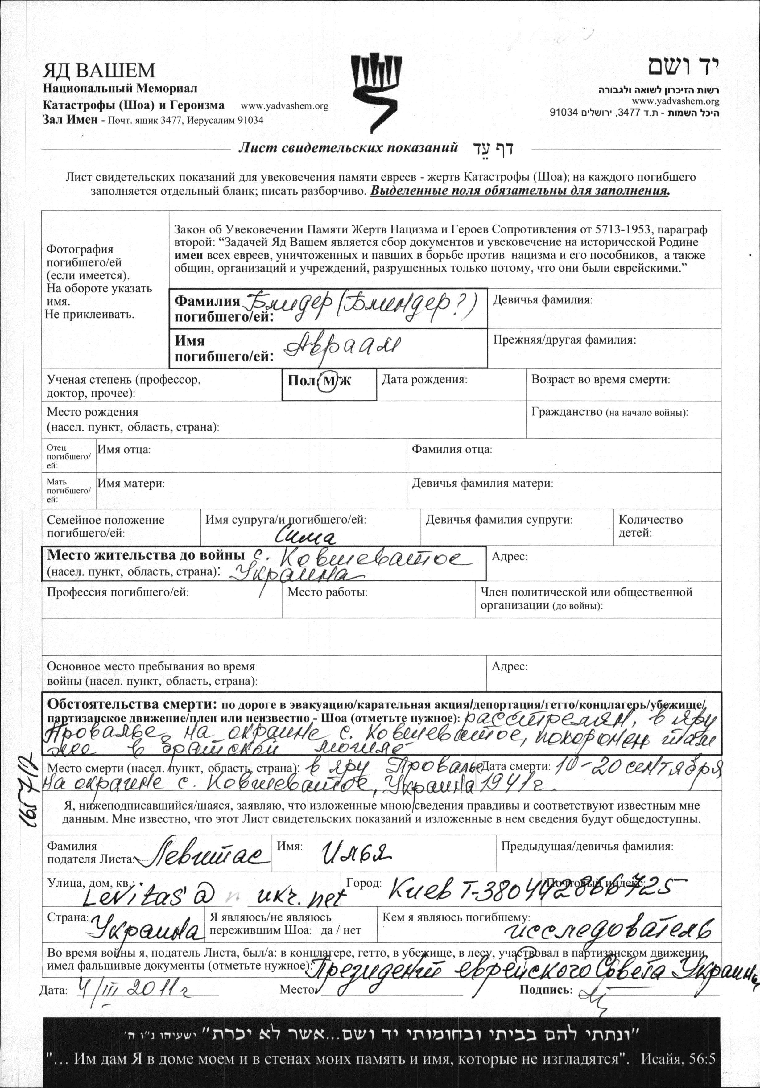 Blinder Avraam Kovshevataya, Ukraine (USSR) Page of Testimony