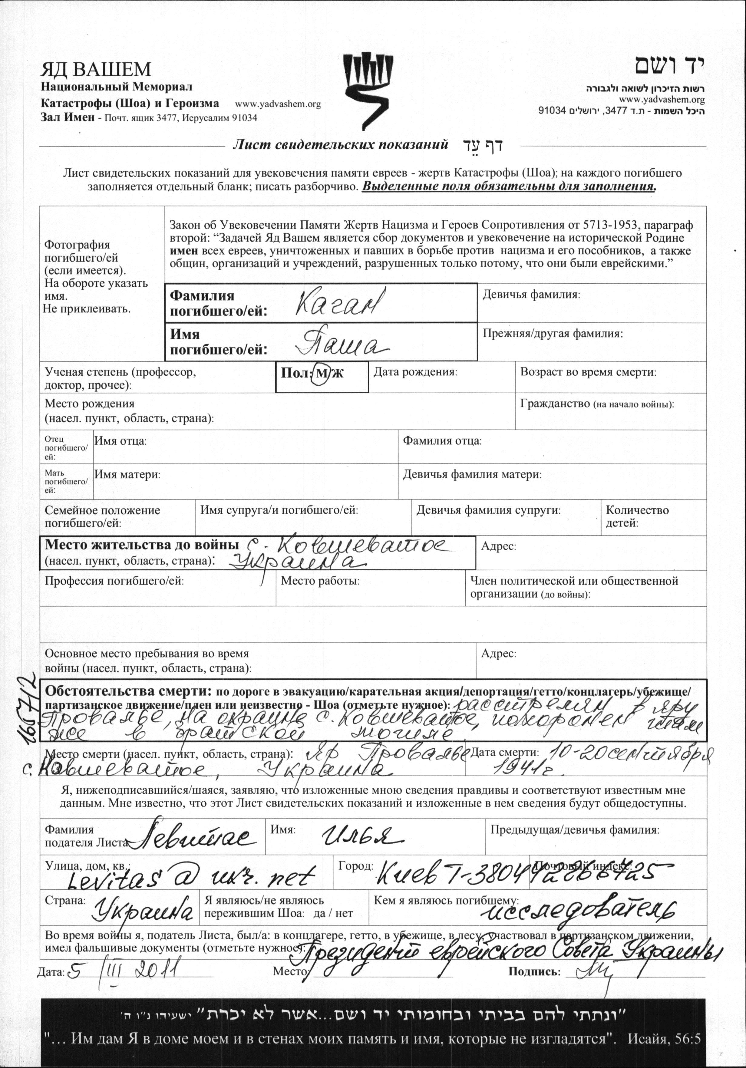 Pasha Kagan. Prior to WWII he lived in Kovshevataya, Ukraine (USSR). During the war he was in Kovshevataya, Ukraine (USSR). Pasha was murdered in the Shoah. Place of death: Kovshevataya, Ukraine (USSR), 09/1941.