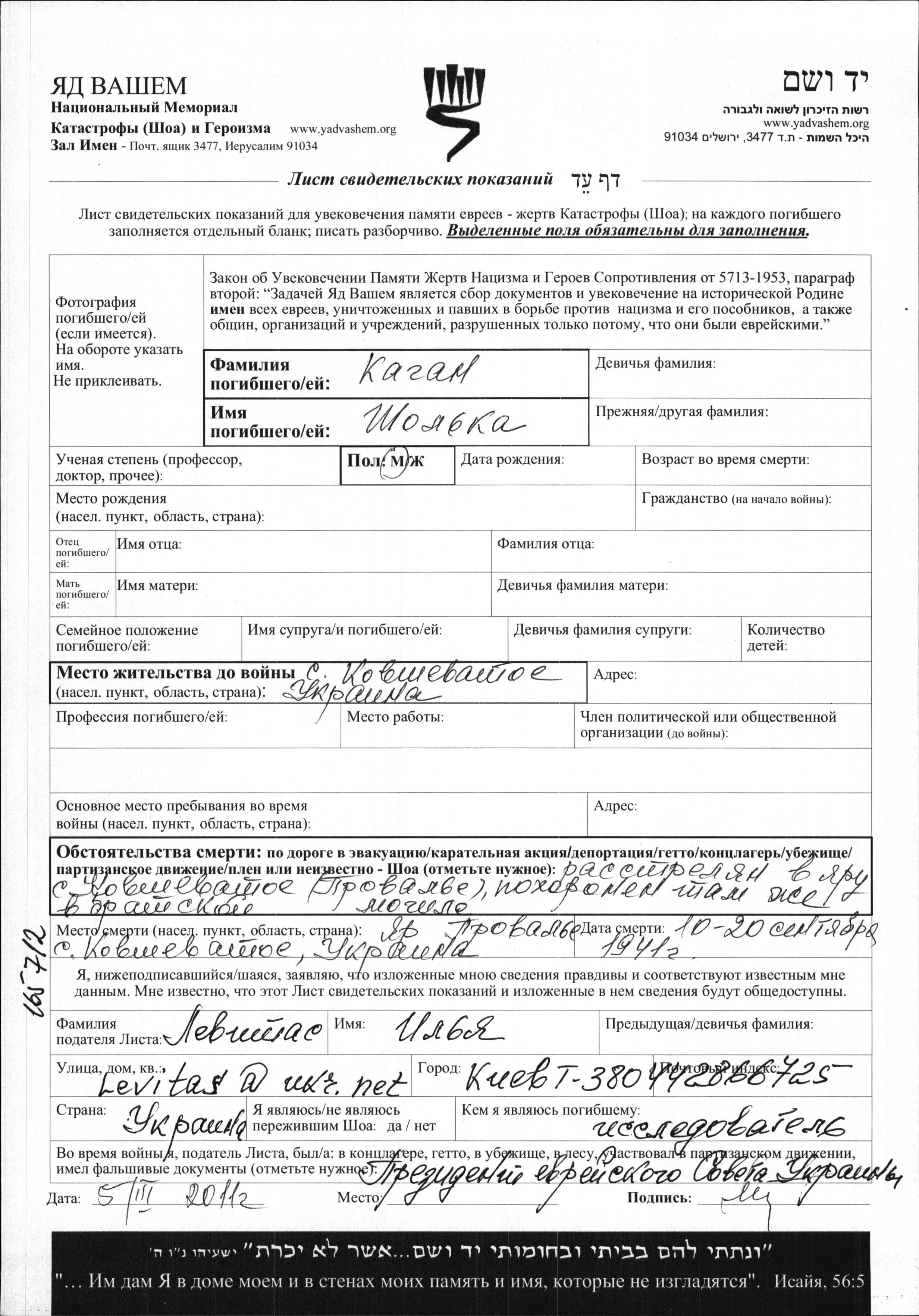 Kagan Sholka Kovshevataya, Ukraine (USSR) Page of Testimony