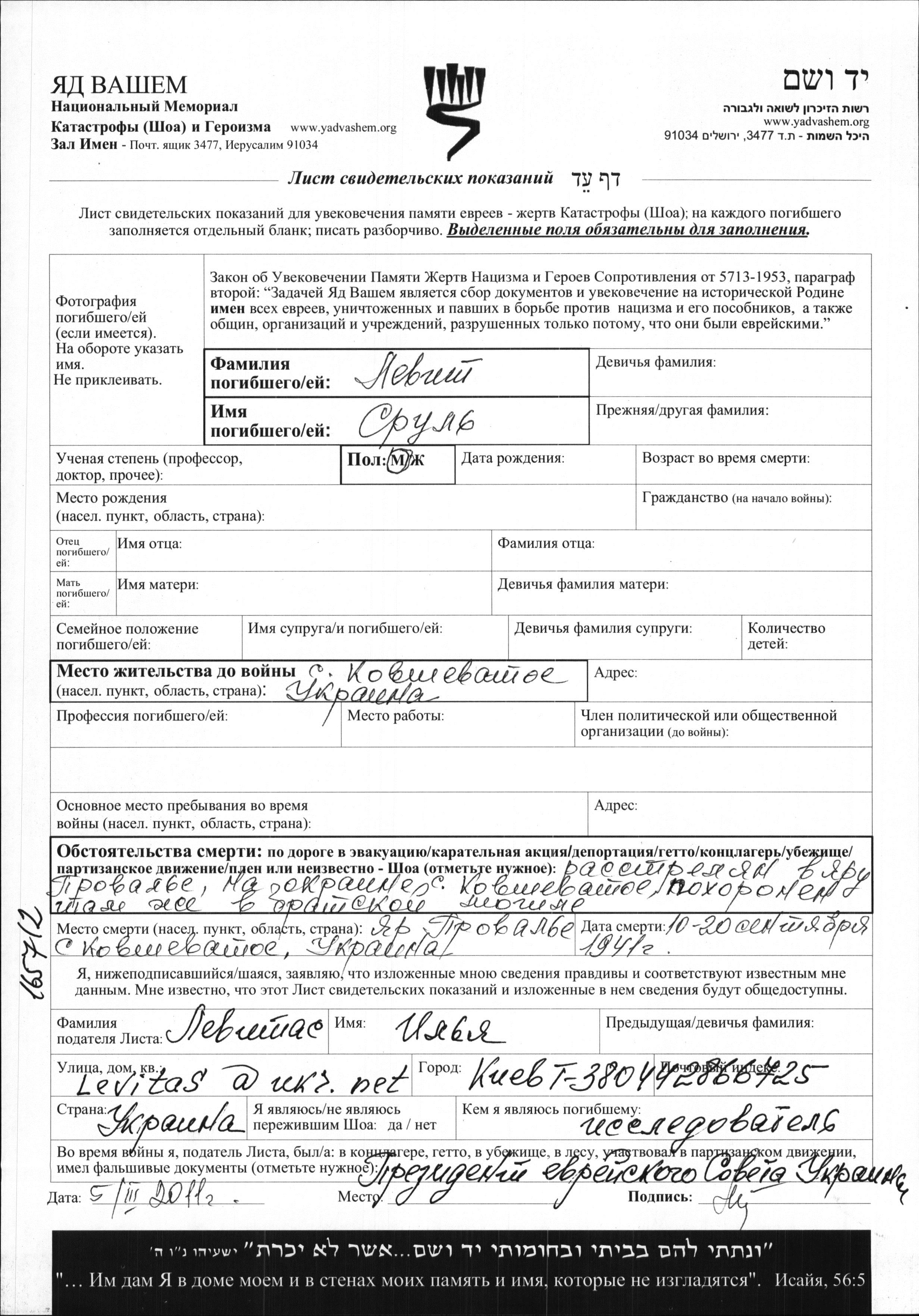 Levit Srul Kovshevataya, Ukraine (USSR) Page of Testimony
