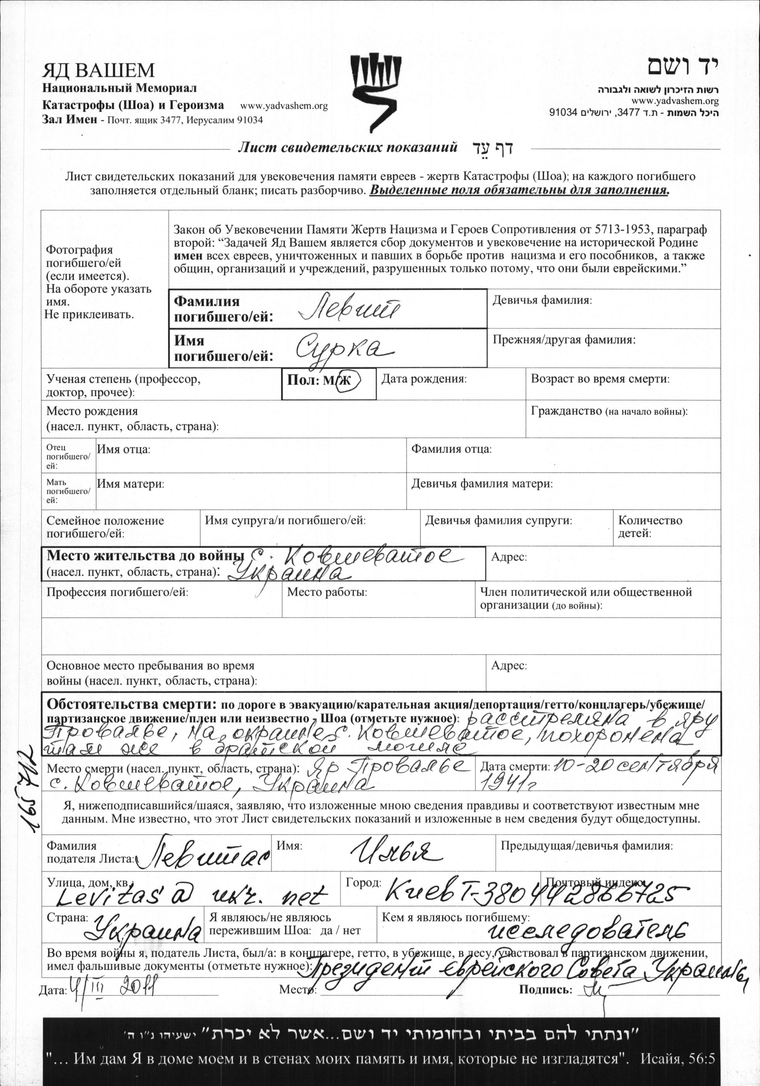 Levit Surka Kovshevataya, Ukraine (USSR) Page of Testimony