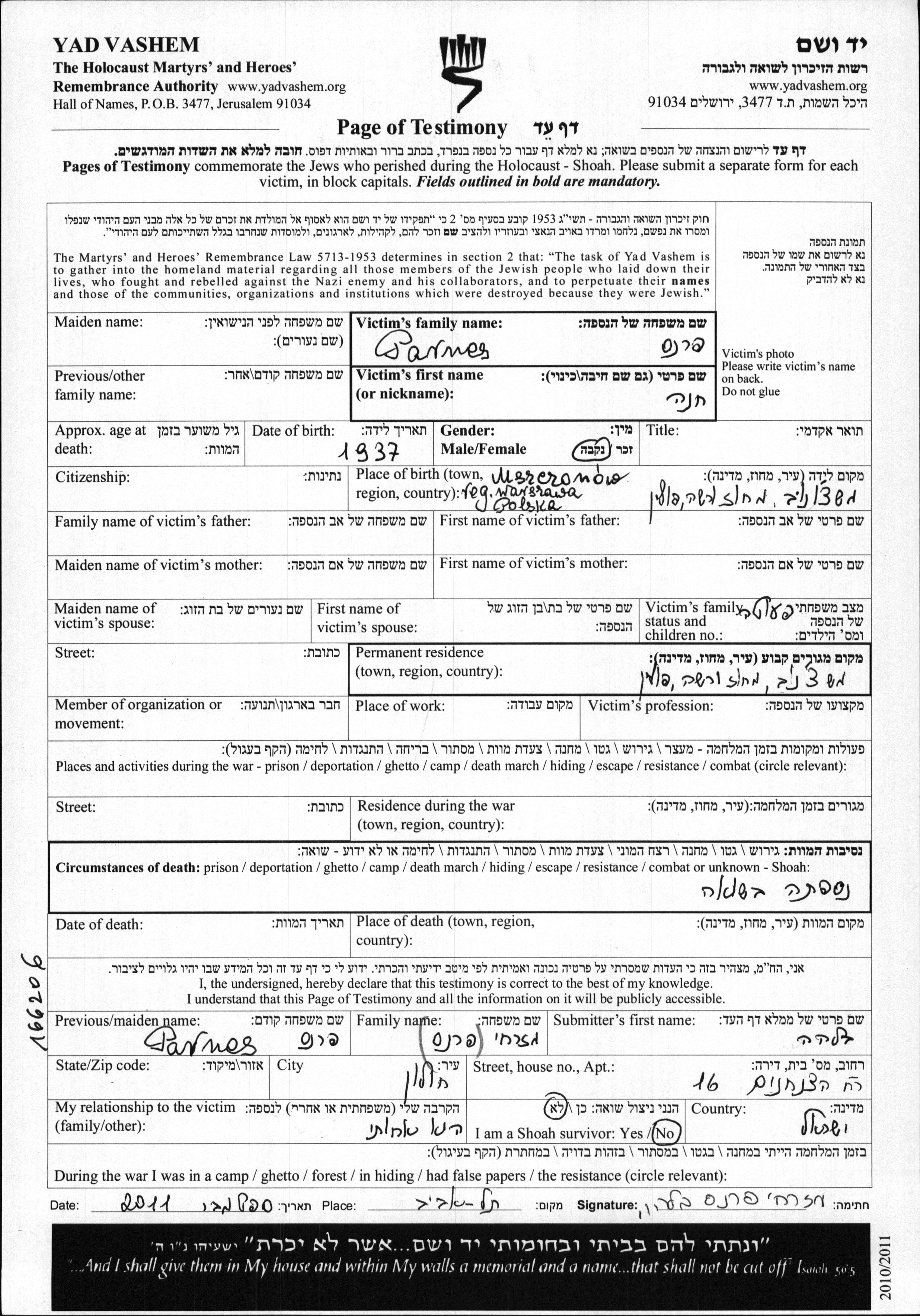 Parnes Chana 1937 Mszczonow, Poland Page of Testimony