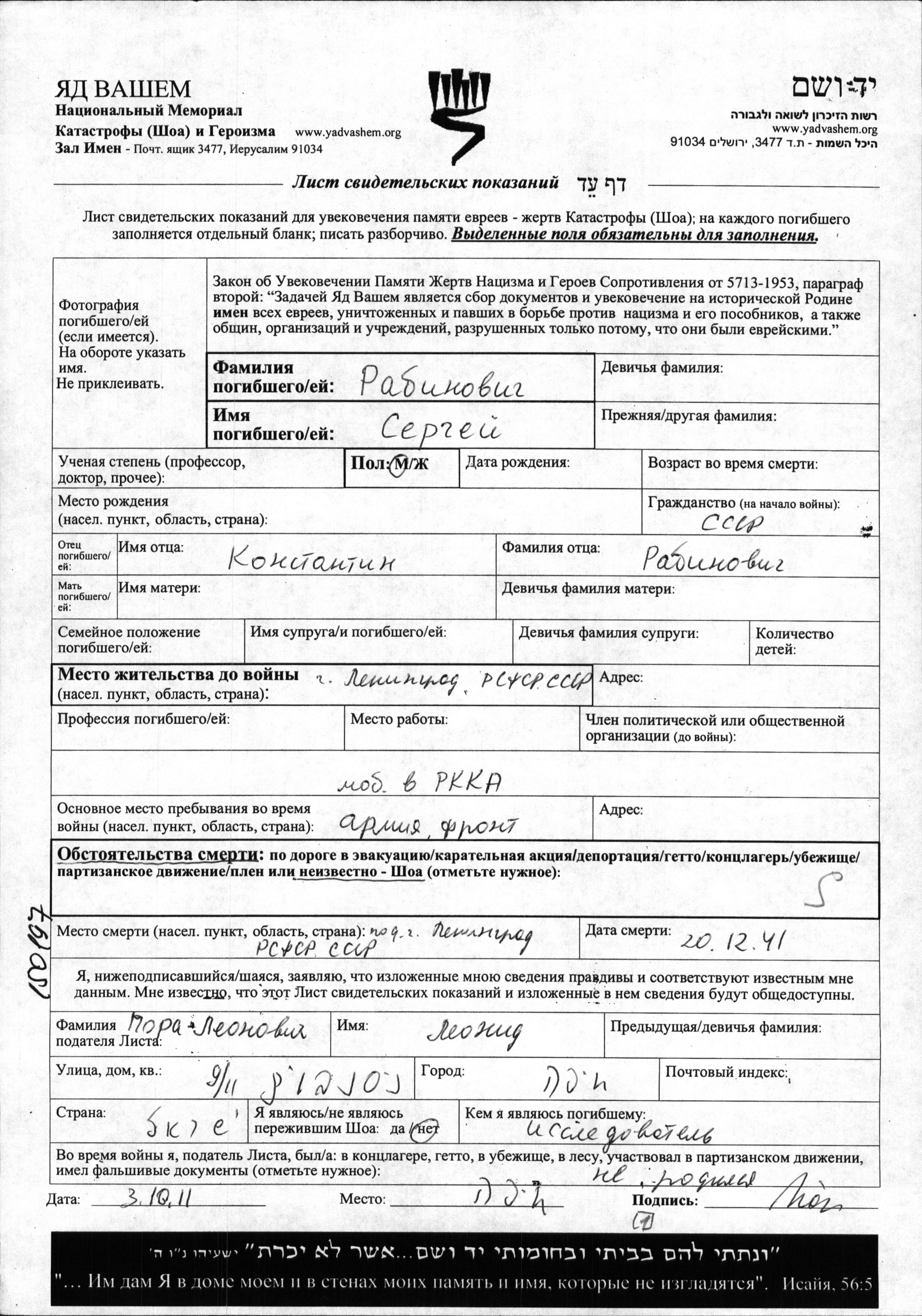 Sergey Rabinovich was born to Konstantin. Prior to WWII he lived in Leningrad, Russia (USSR). During the war he was in the Soviet armed forces. Sergey was killed in military service in WWII. Place of death: Leningrad City, Russia (USSR), 20/12/1941.