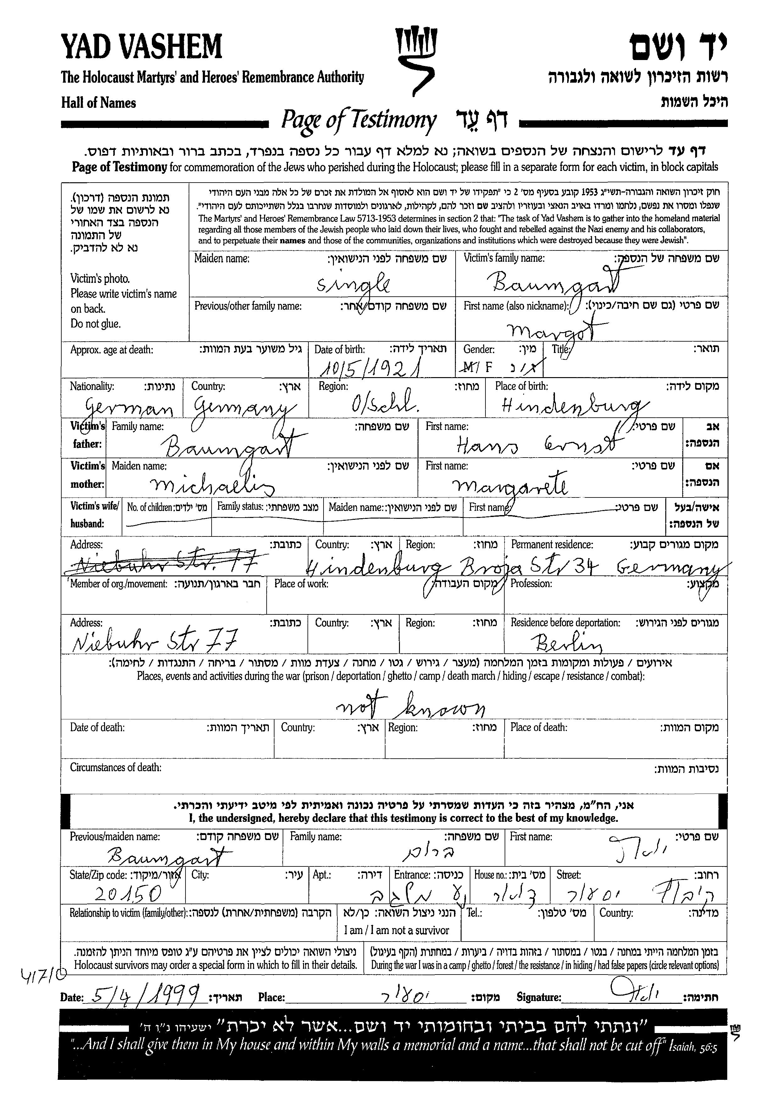 Baumgart Margot 1921 Hindenburg, Germany Page of Testimony