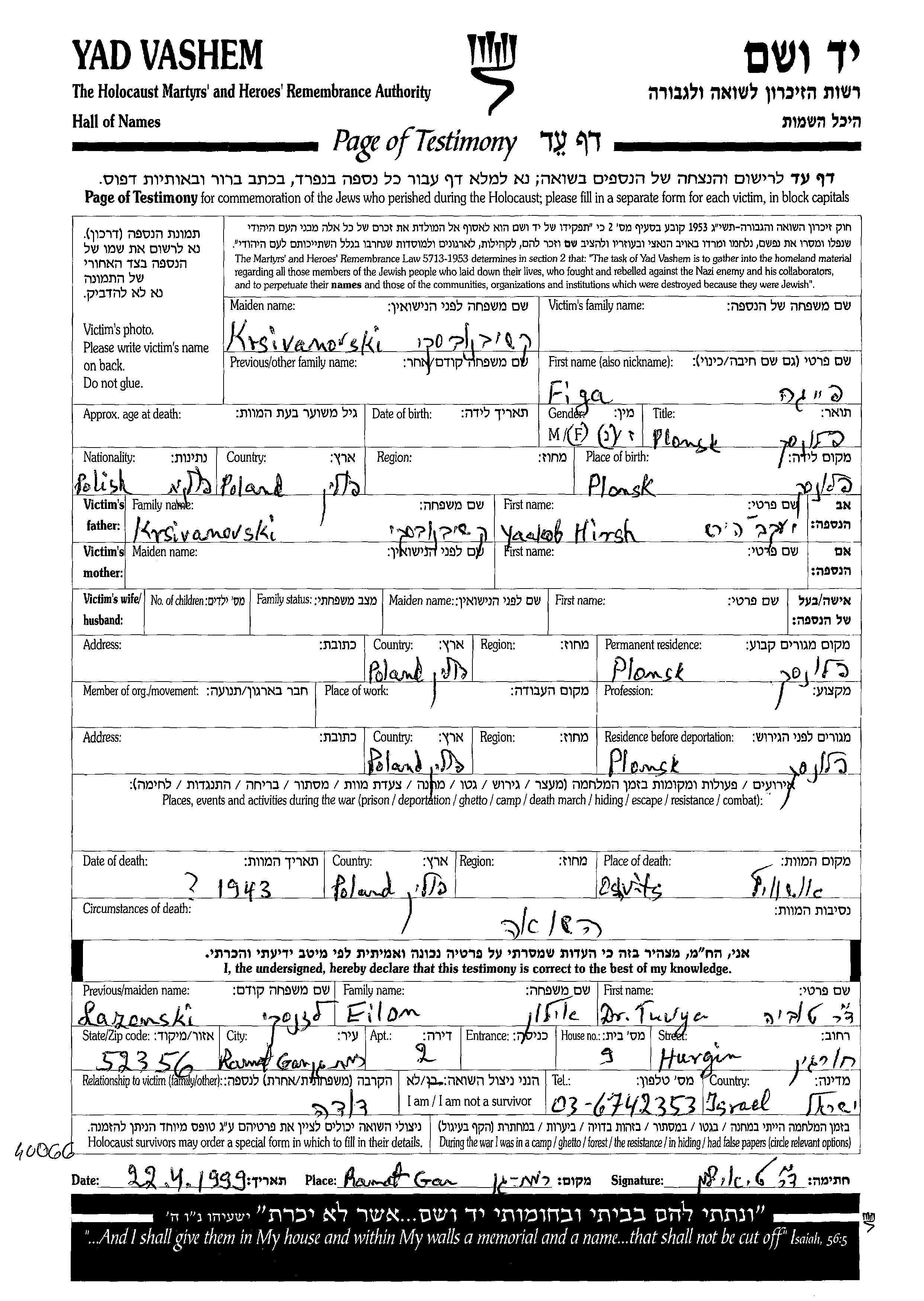 Figa Surname unknown nee Krsivanovski was born in Plonsk, Poland to Yaakob Hirsh. Prior to WWII she lived in Plonsk, Poland. During the war she was in Plonsk, Poland. Figa was murdered in the Shoah. Place of death: Auschwitz, Poland, 1943.