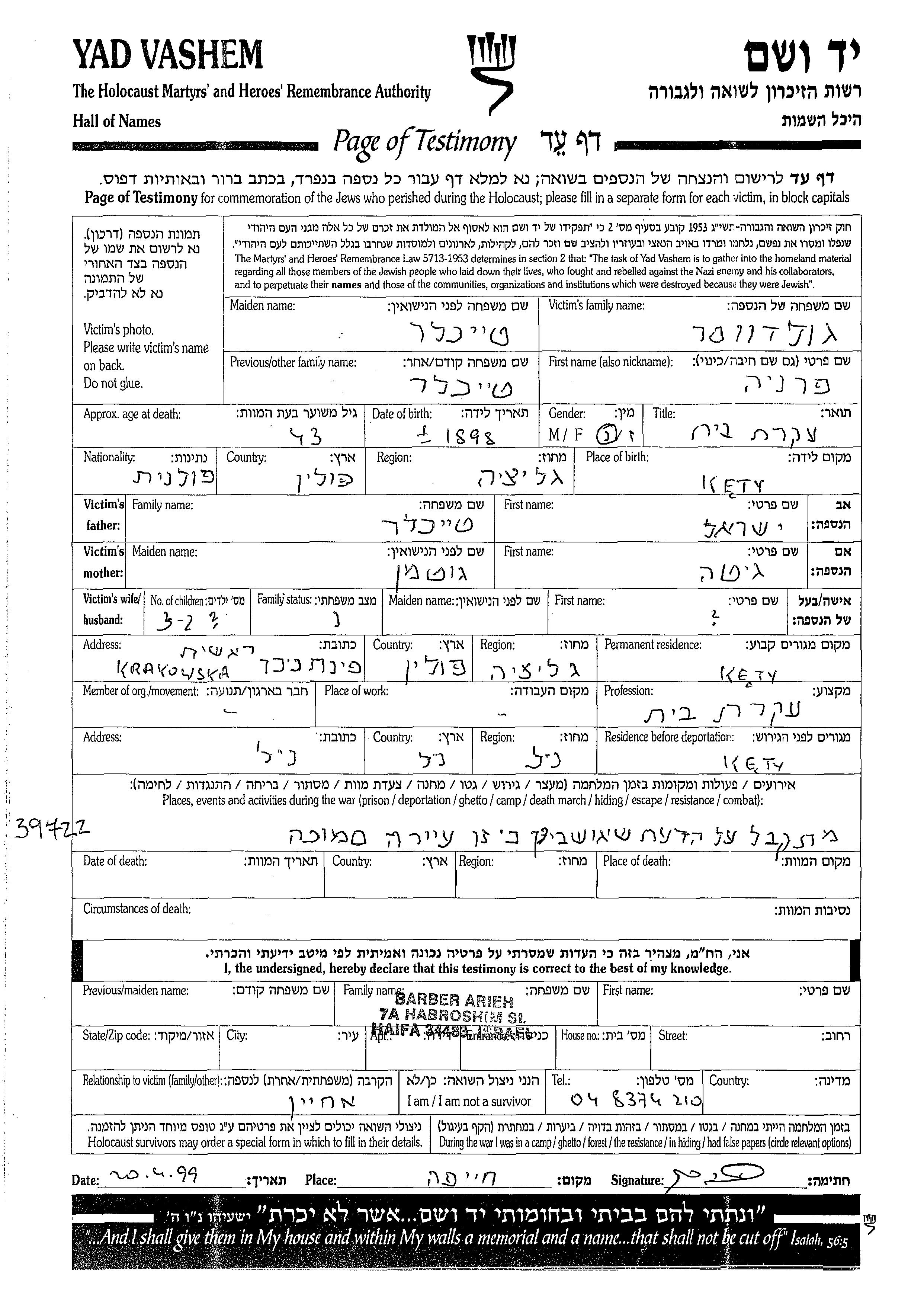 Frania Goldvaser nee Teikhler was born in Kety, Poland, 1898 to Yisrael and Gita. She was a housewife and married. Prior to WWII she lived in Kety, Poland. During the war she was in Kety, Poland. Frania was murdered in the Shoah. Place of death: Auschwitz, Poland.
