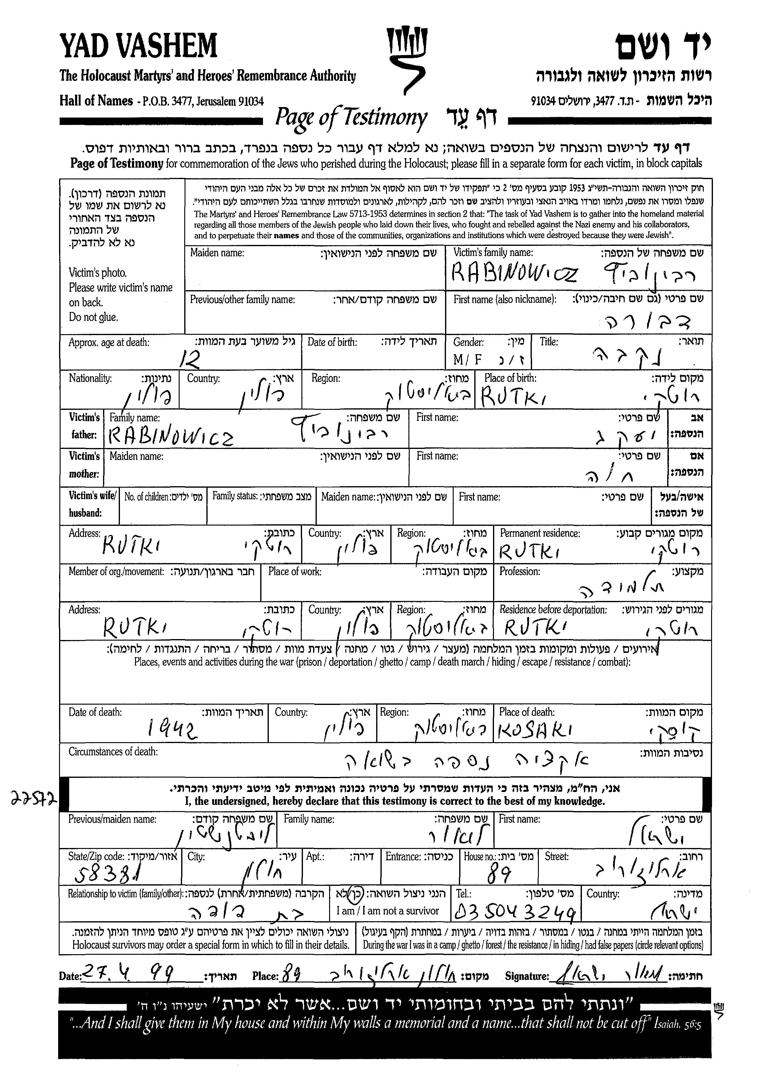 Rabinowicz Dvora Rutki, Poland Page of Testimony