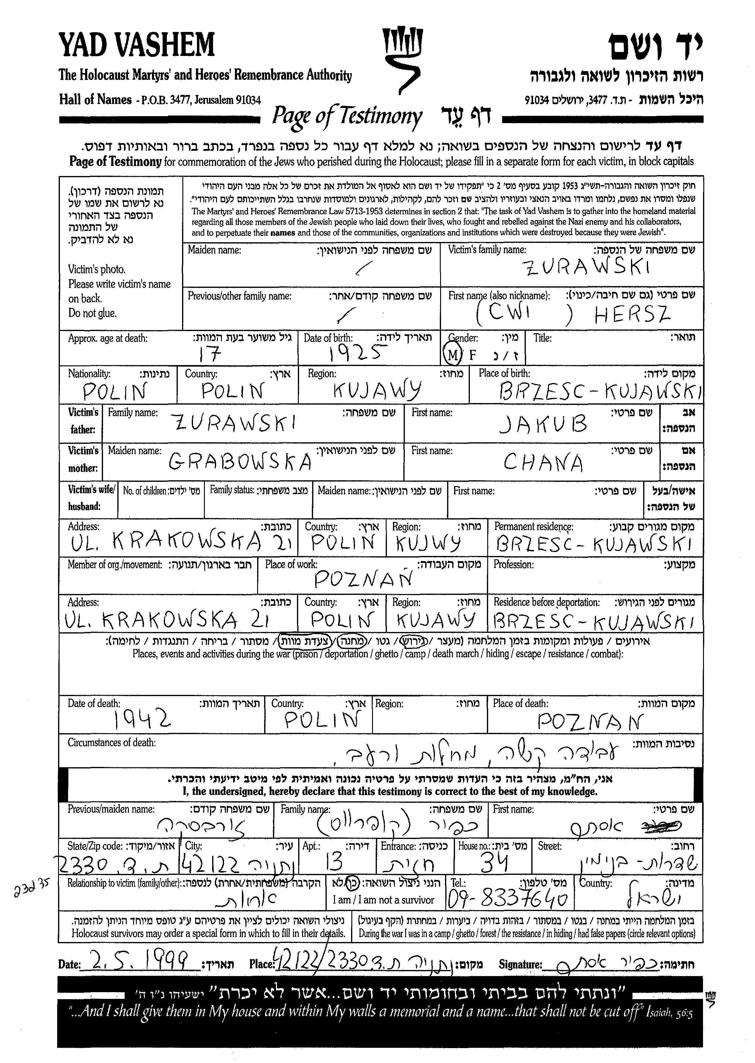 Hersz Cwi Zurawski was born in Brzesc Kujawski, Poland, 1925 to Jakub and Chana. Prior to WWII he lived in Brzesc Kujawski, Poland. During the war he was in Brzesc Kujawski, Poland. Hersz Cwi was murdered in the Shoah. Place of death: Poznan, Poland, 1942.