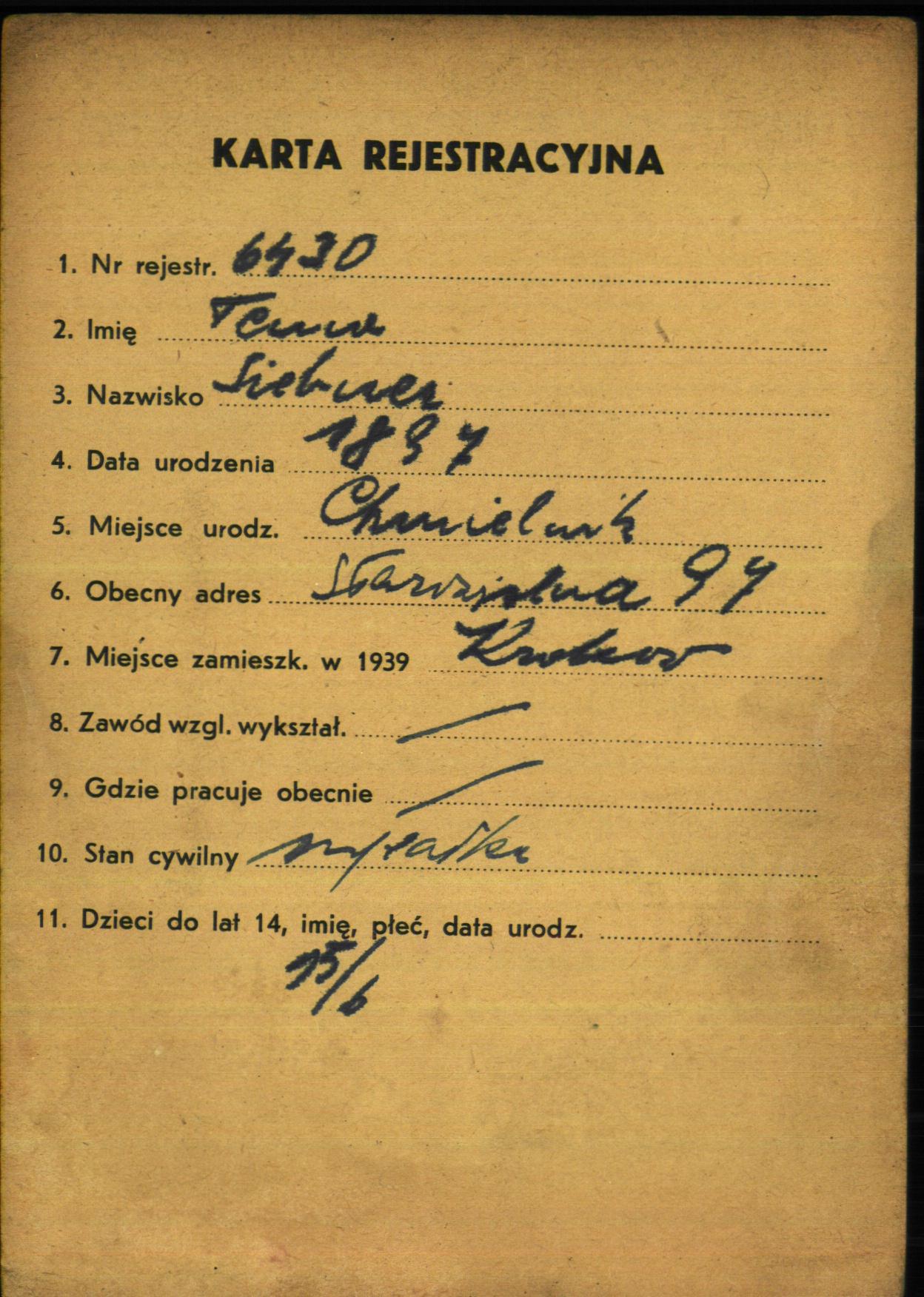 Tema Siebner was born in Chmielnik, Poland, 1897. She was married. Prior to WWII she lived in Krakow, Poland.