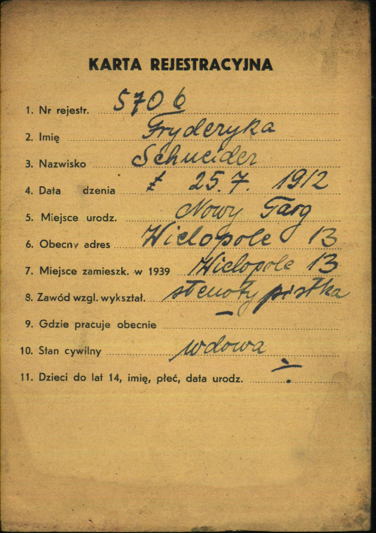 Fryderyka Schneider was born in Nowy Targ, Poland, 1912. She was a stenographer and a widow. Prior to WWII she lived in Krakow, Poland.