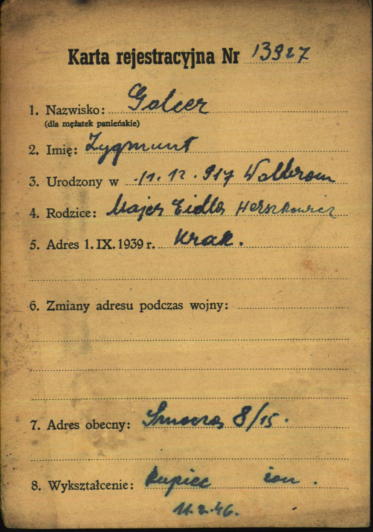 Zygmunt Golcer was born in Wolbrom, Poland, 1917 to Majer and Eidla. He was a merchant and married. Prior to WWII he lived in Krakow, Poland.