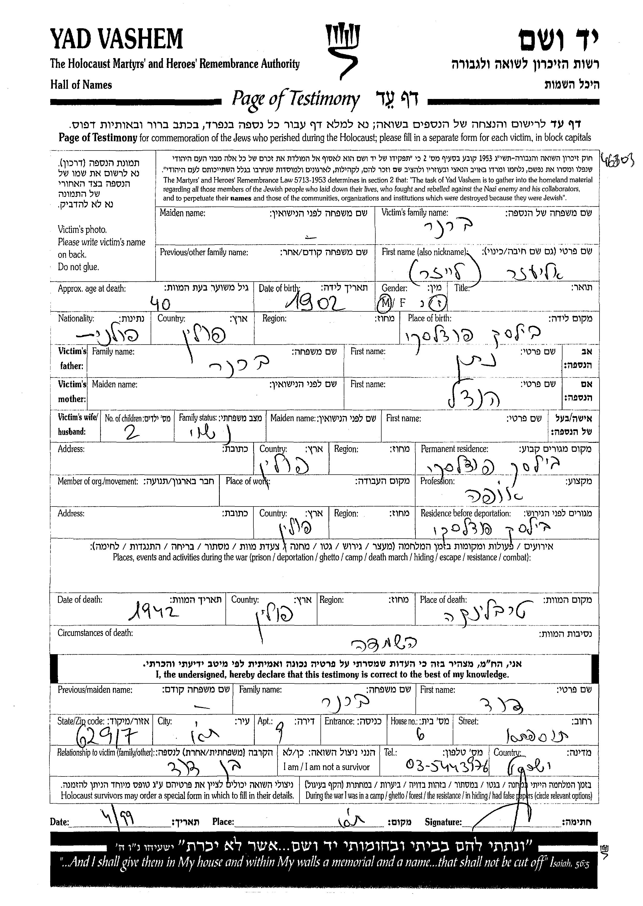 Eliezer Brener was born in Bilsk, Poland, 1902 to Natan and Hendel. He was a baker and married. Prior to WWII he lived in Bilsk, Poland. During the war he was in Bilsk, Poland. Eliezer was murdered in the Shoah. Place of death: Treblinka, Poland, 1942.