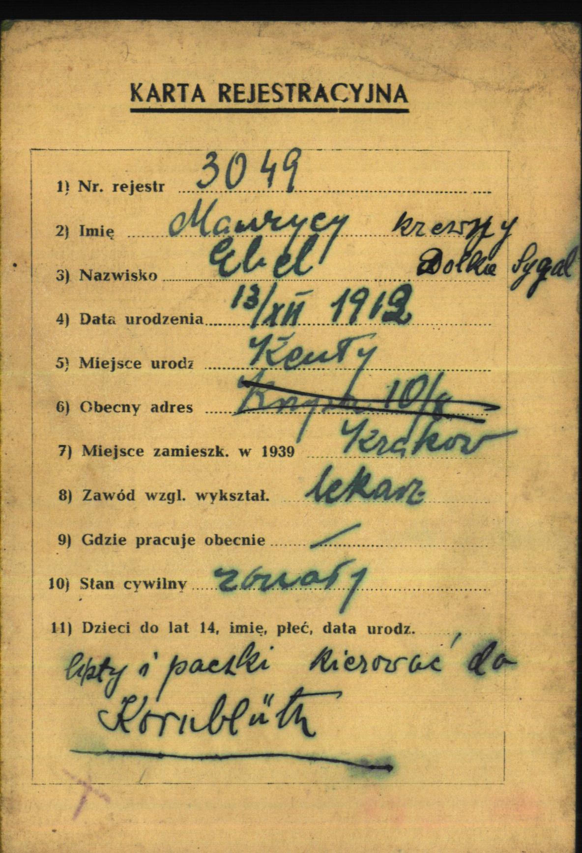 Maurycy Ebel was born in Kety, Poland, 1912. He was a physician and married. Prior to WWII he lived in Krakow, Poland.